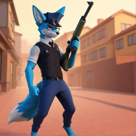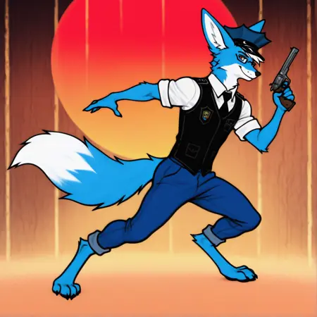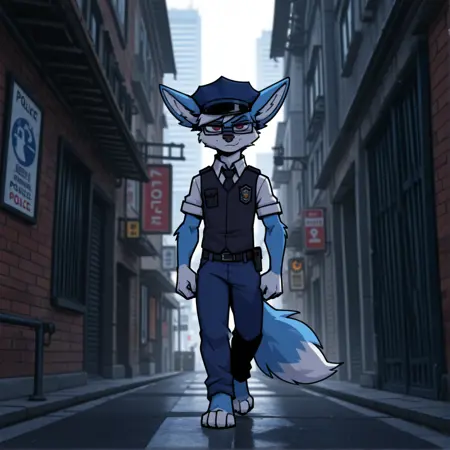 의상: 뾰족모자, 경찰 복장, 흰색 셔츠, 칼라 셔츠, 반팔, 검은 조끼, 경찰 조끼, 검은 넥타이