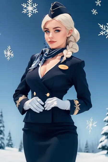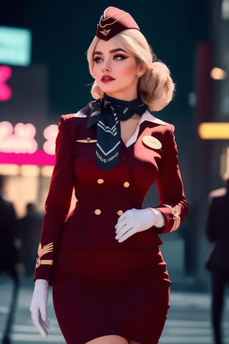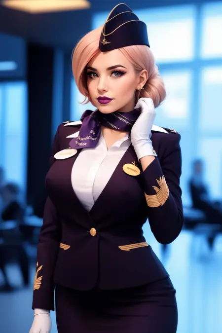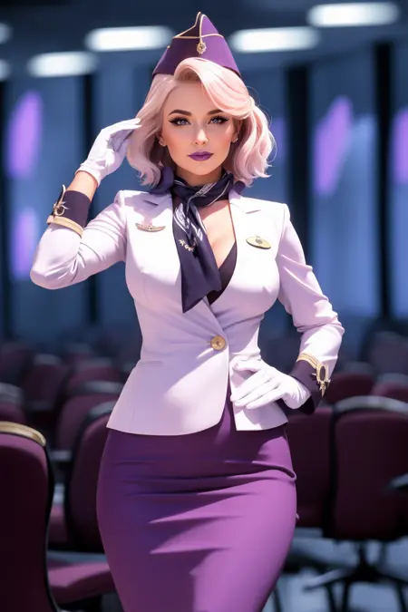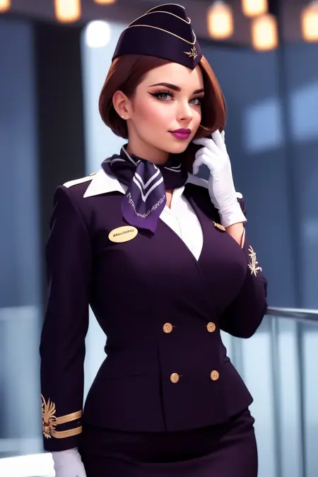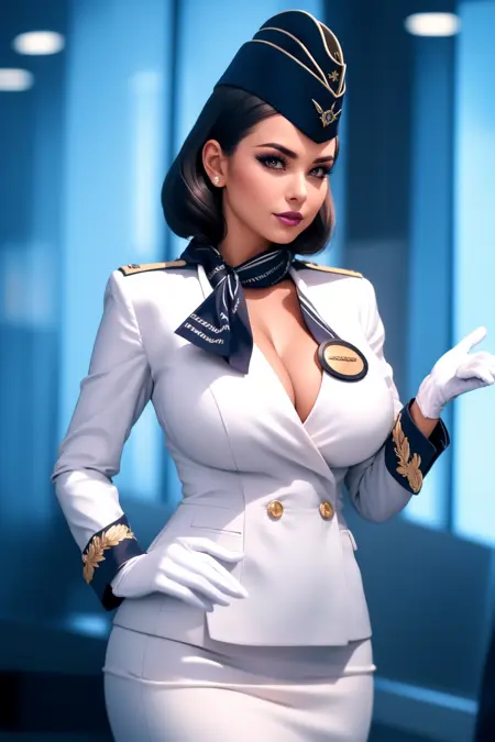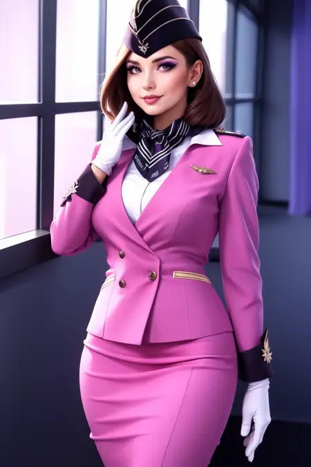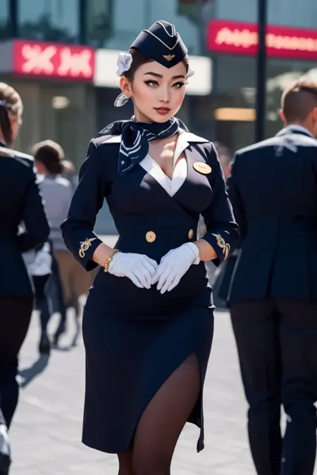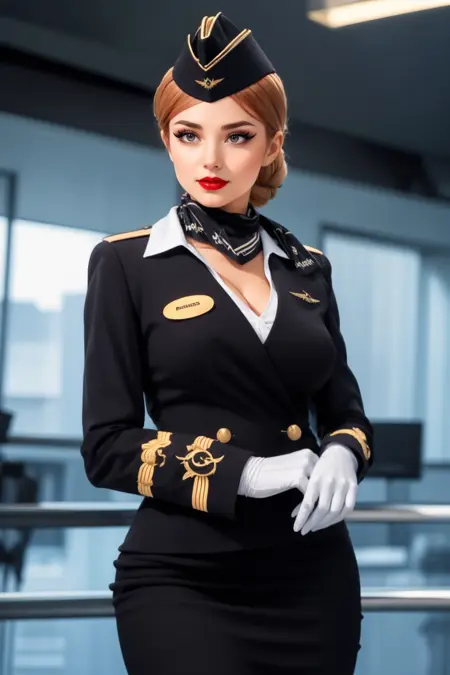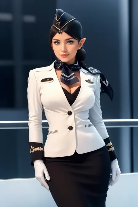 st3w4rd3ss, 유니폼, 흰 장갑, 라펠, 군용 모자, 비행복, 이름표, 연필 스커트, 스카프, 소매 단추, 허리 곡선 형태로 호출