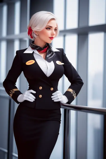 Invoke with st3w4rd3ss, uniform, white gloves, lapel, garrison cap, flight in, name tag, pencil skirt, scarf, cuffs, hourglass figure