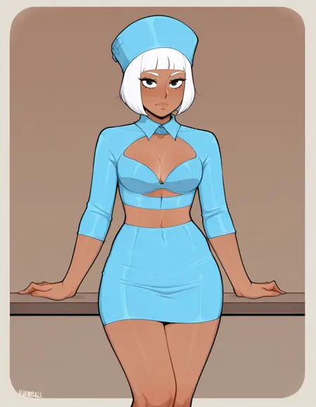 st3w4rd3ss, 매끄러운 밥 컷, 앞머리, 흰색 머리, 파란색 짧은 드레스, 겉옷(의상), 파란색 머리장식, 허리선, 가슴 부분 절개