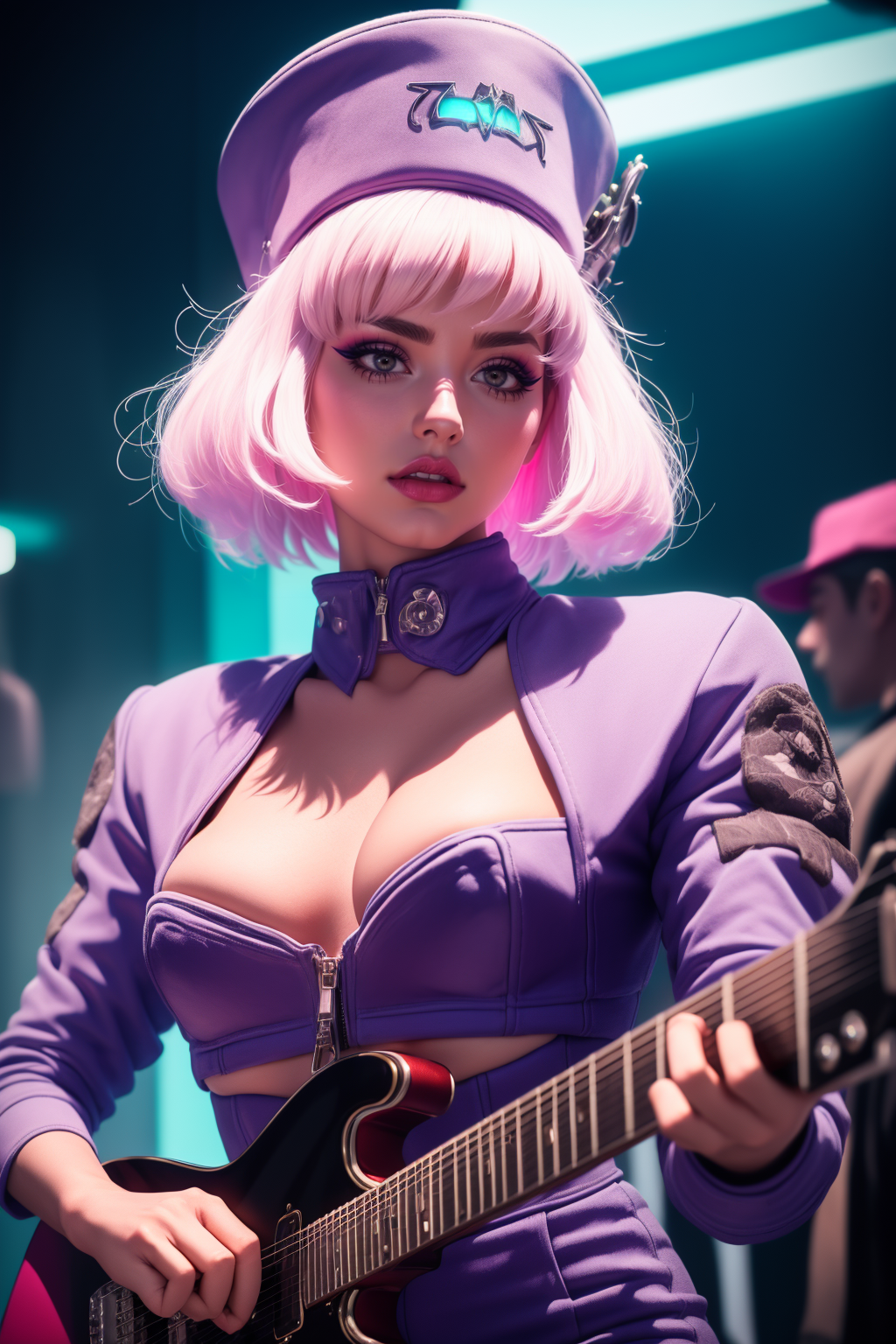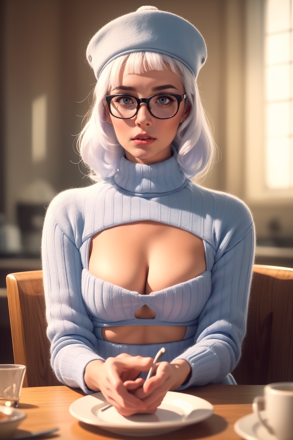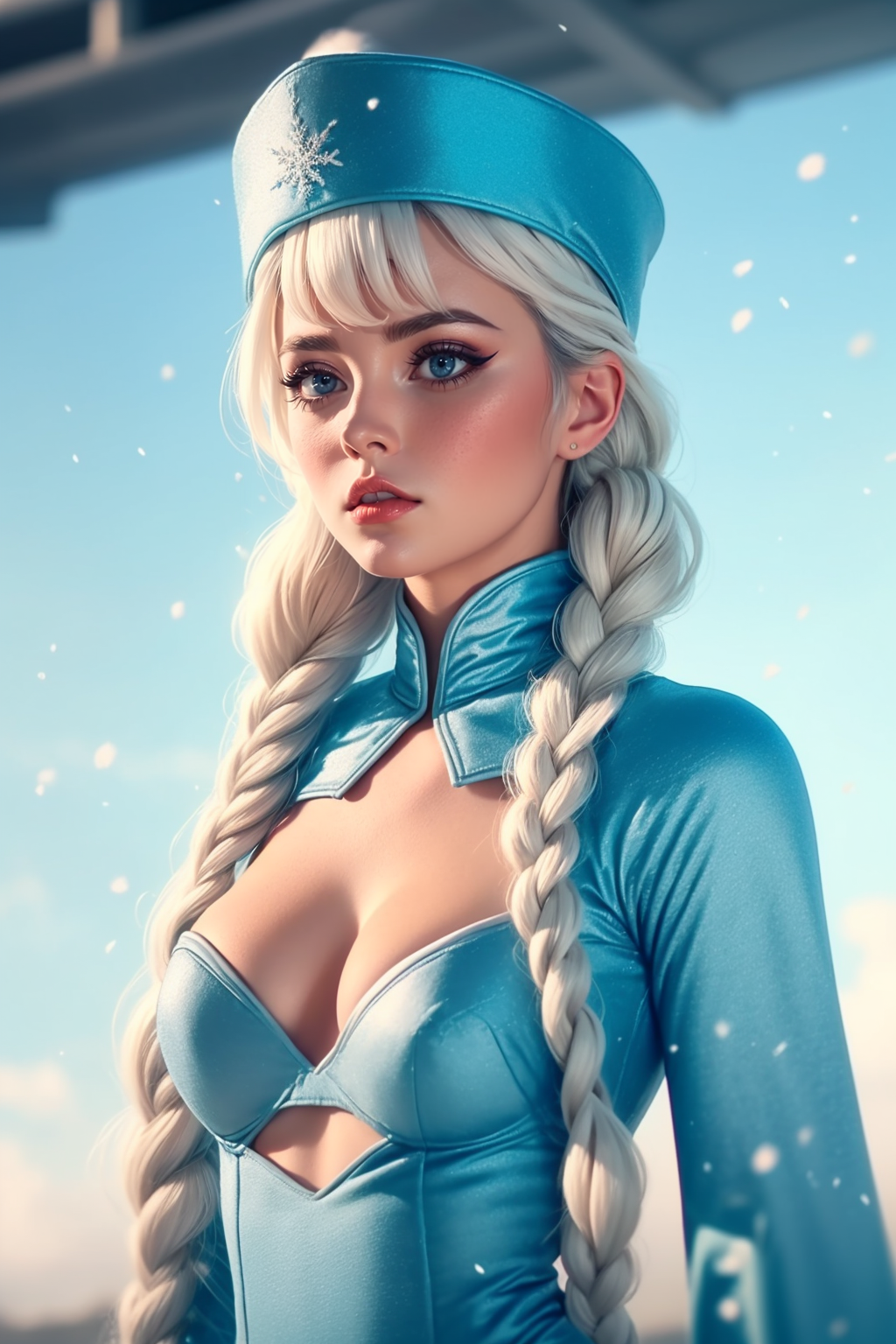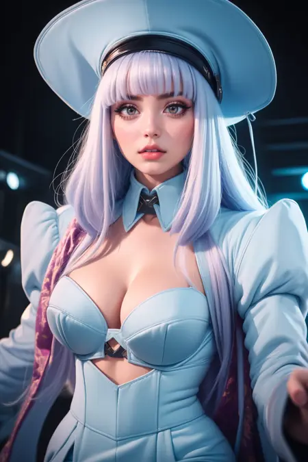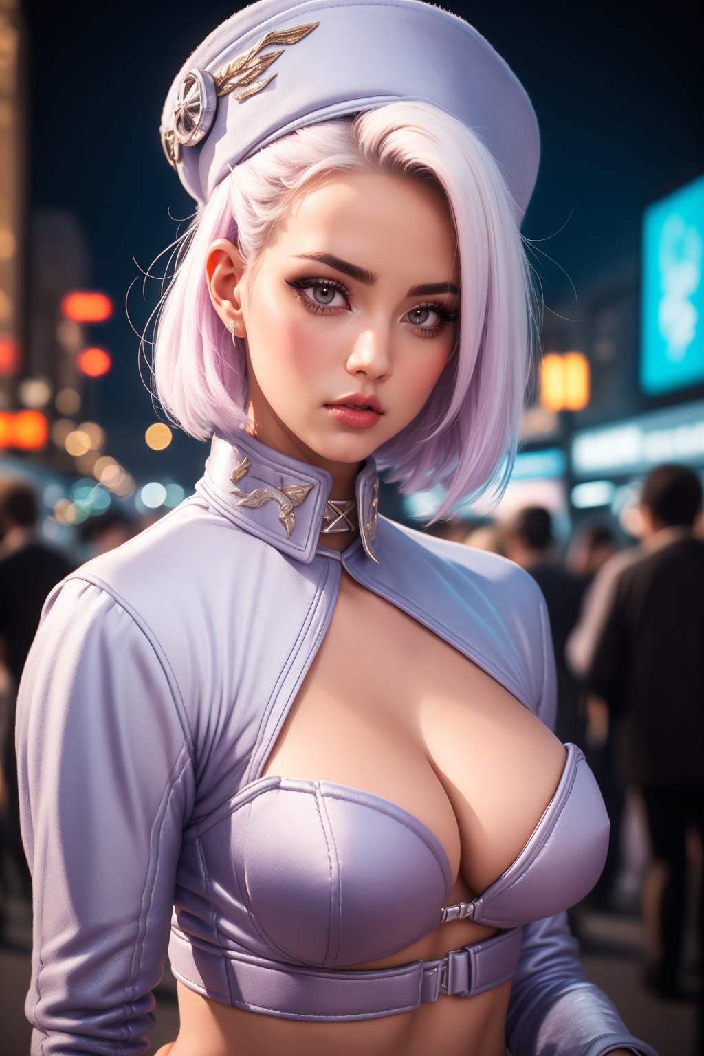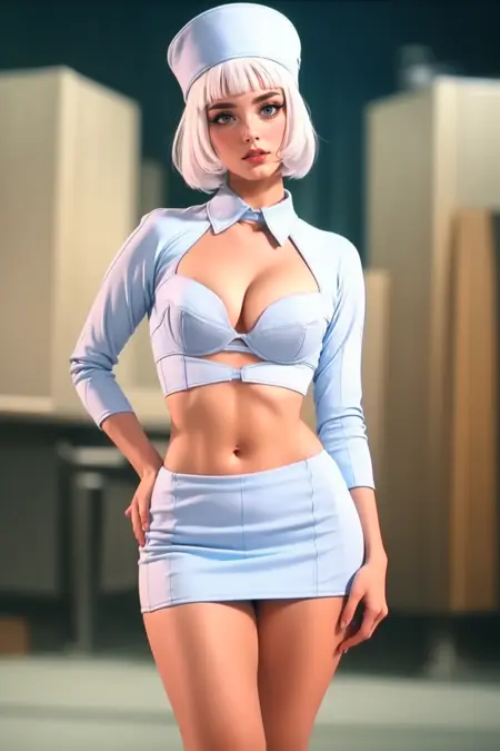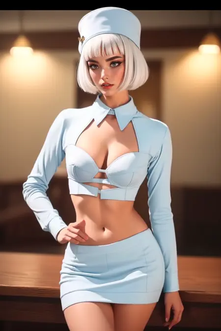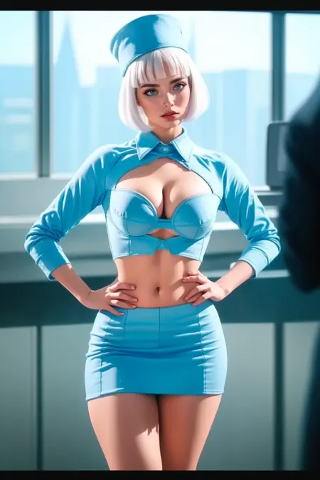 st3w4rd3ss, blue miniskirt, shrug \(clothing\), blue bra, shirt collar, midriff (cleavage cutout) high heels, bangs, white hair, bob cut, shirt, large breasts