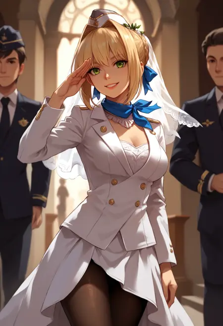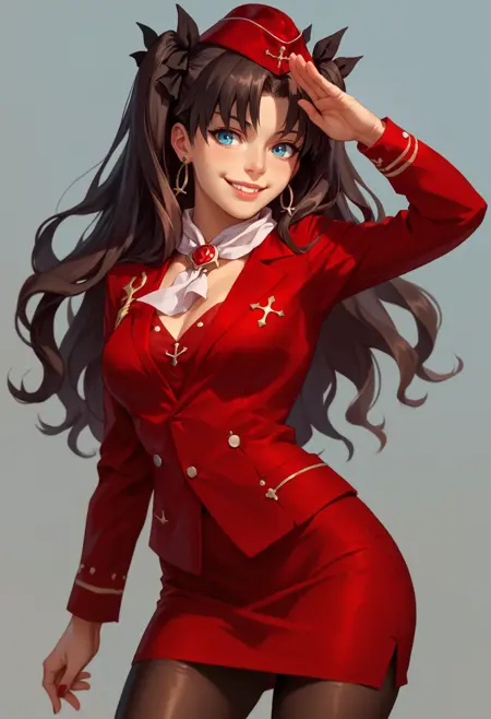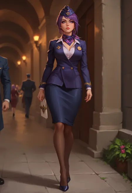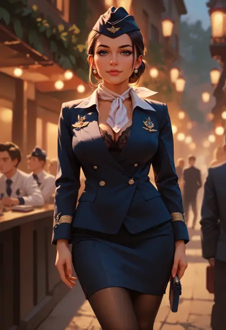 st3w4rd3ss, 青いジャケット、フォーマル、青いスカーフ、白いシャツ、ガーリソン帽、鉛筆スカート、黒いパンティーストッキング、ハイヒール、白い手袋