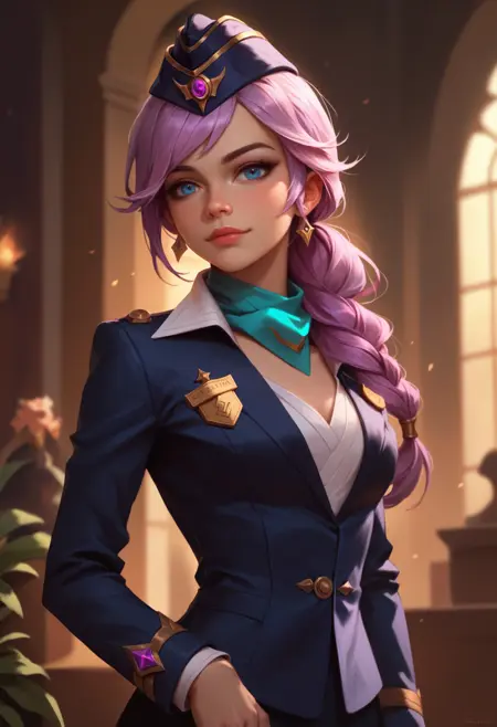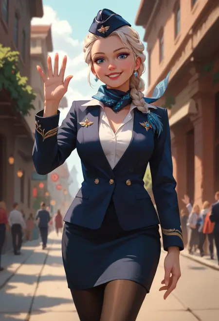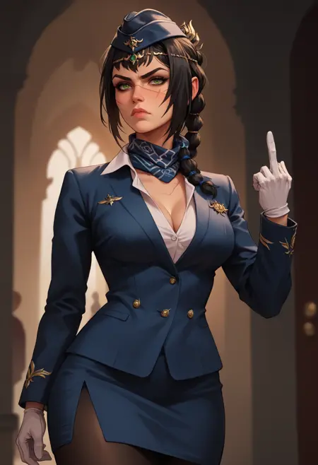 st3w4rd3ss, 파란 재킷, 정장, 파란 스카프, 흰 셔츠, 가리슨 캡, 연필 치마, 검은 팬티스타킹, 하이힐, 흰 장갑