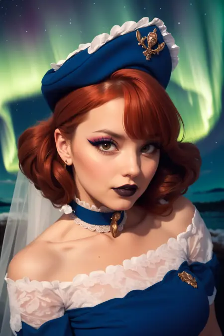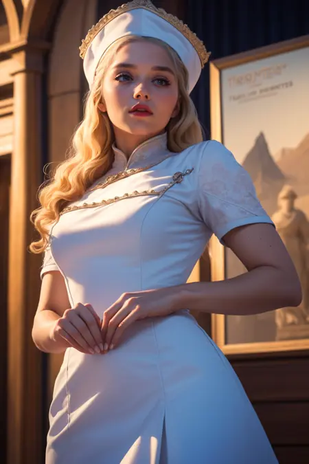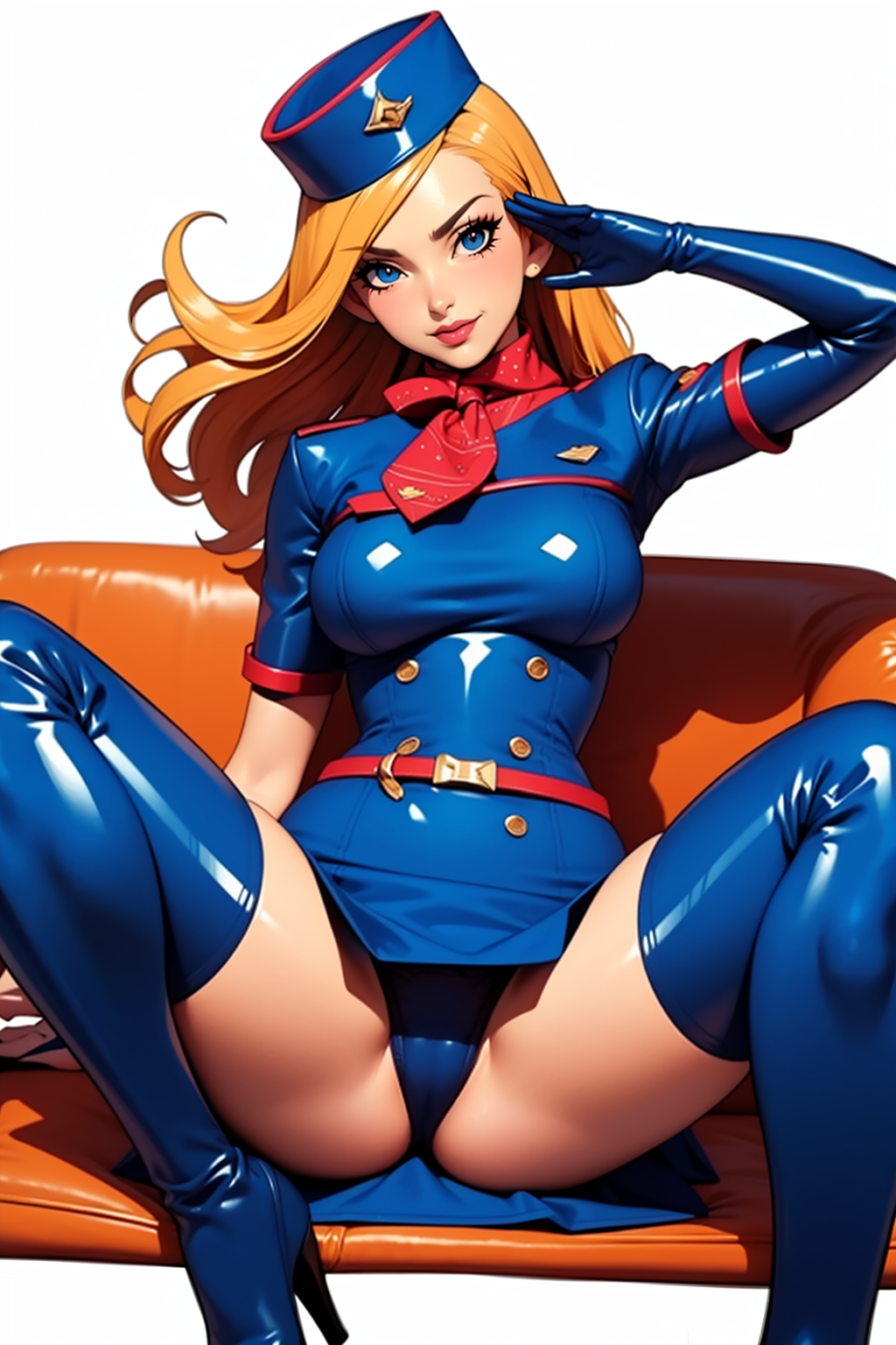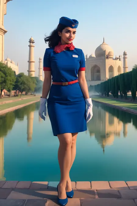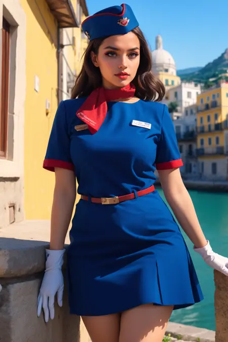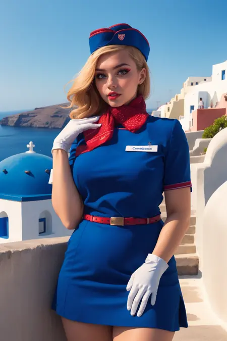 SD1.5st3w4rd3ss, uniform, white gloves, blue dress, scarf, name tag, blue headwear, simplistic, blue skirt, red belt, short sleeves