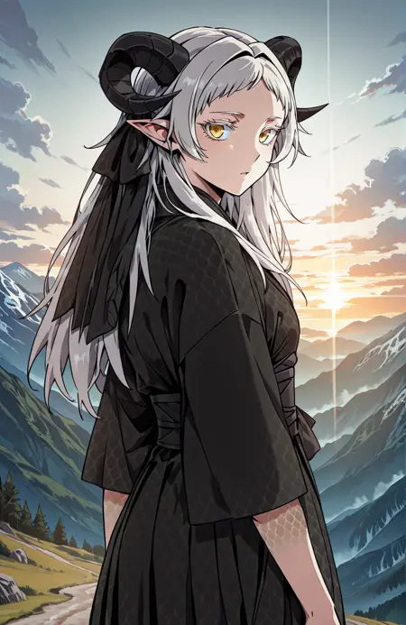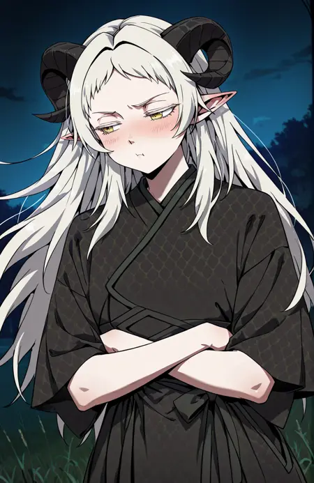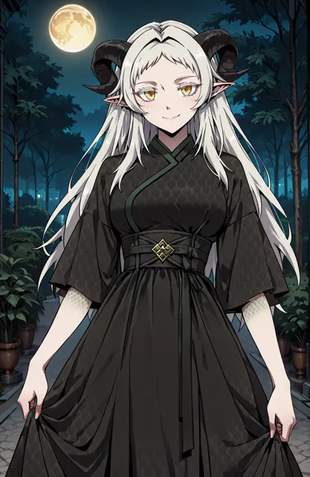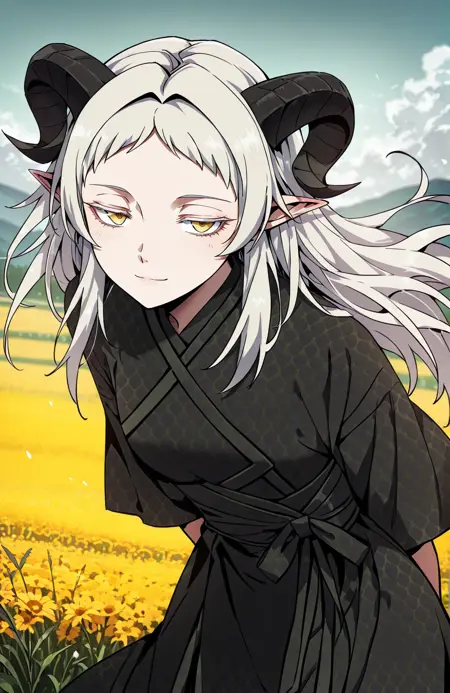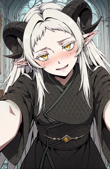Sylvie, 1girl, solo, yellow eyes, white hair, long hair, short bangs, parted bangs, hair between eyes, sidelocks, horns, black horns, pointed ears,