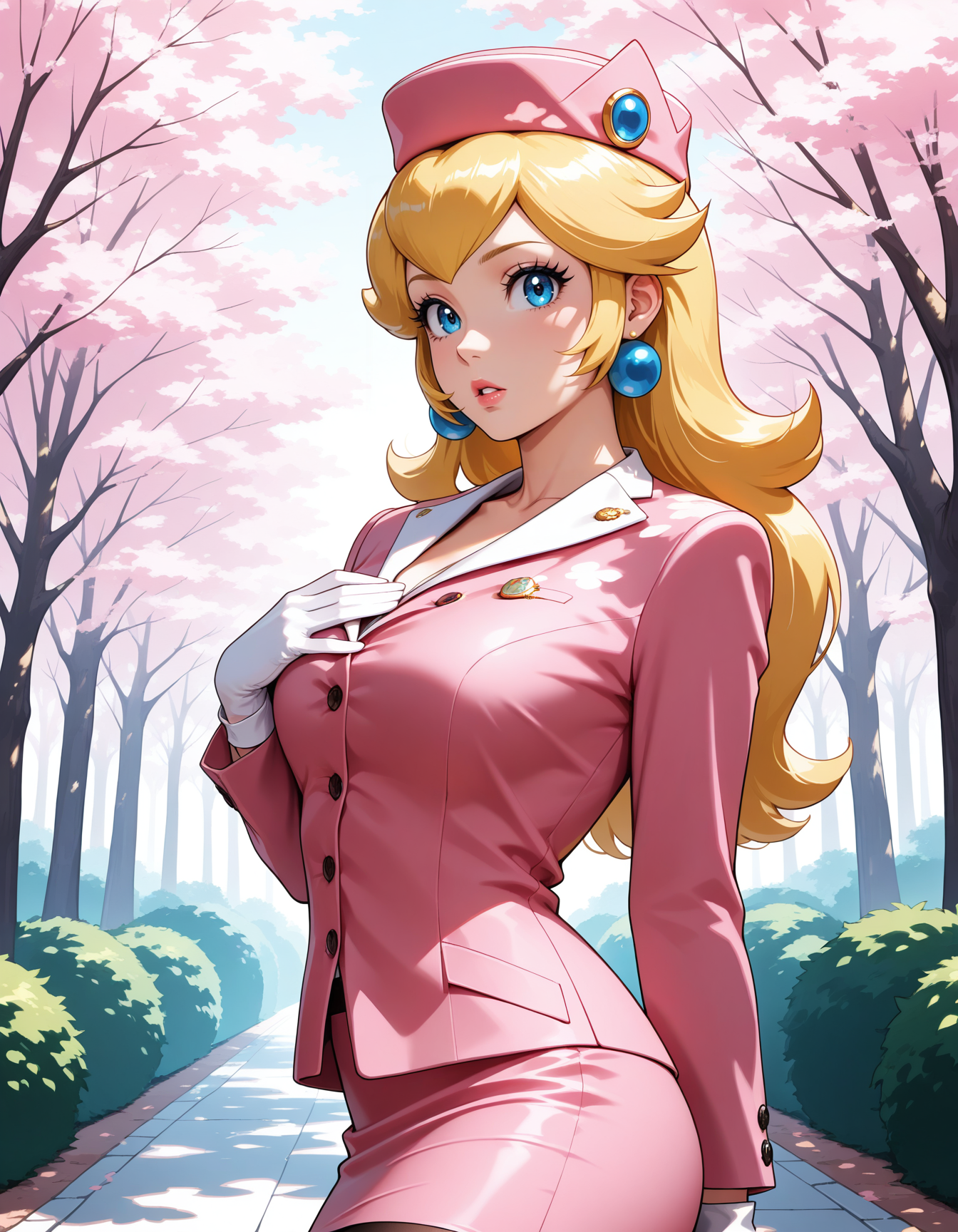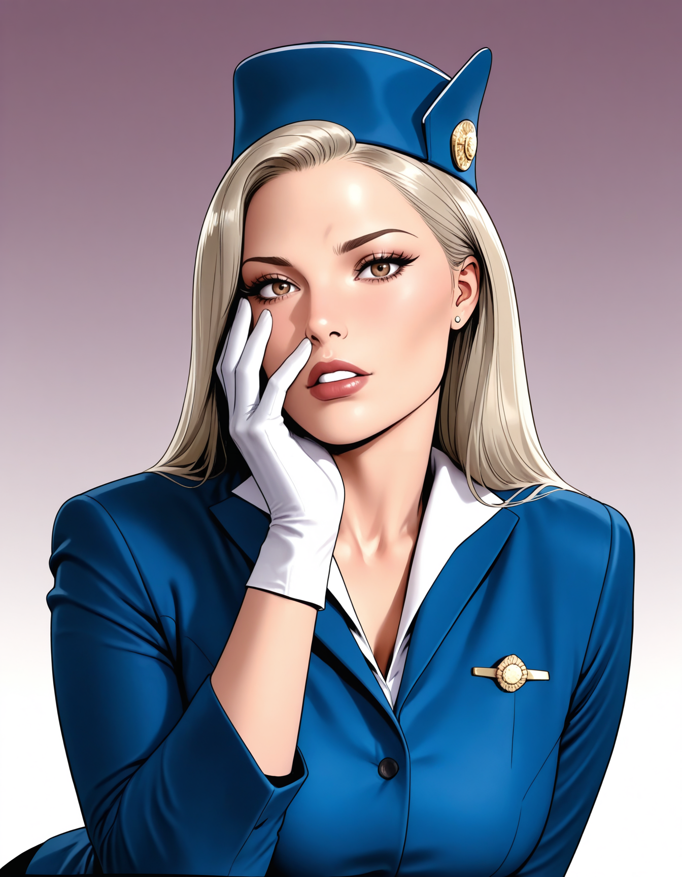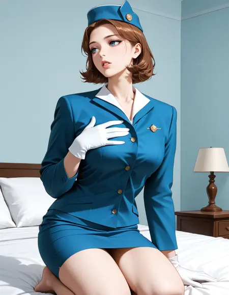 复古发型,蓝色制服,蓝色夹克,纽扣,铅笔裙,纽扣,白色衬衫领,蓝色衬衫领,蓝色帽子,(asymmetrical fin hat),飞行徽章,中等袖子,白色手套,连裤袜