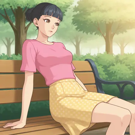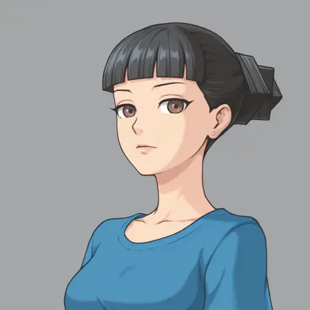 整体外观标签:短发、黑发、发髻、齐刘海、棕色眼睛