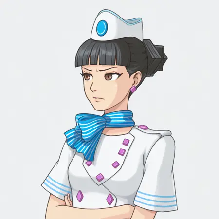 由于《逆转检事》系列游戏的精灵图特性,生成结果通常会呈现她身体侧向的角度。在提示词中使用 正面 可以让她面向前方。