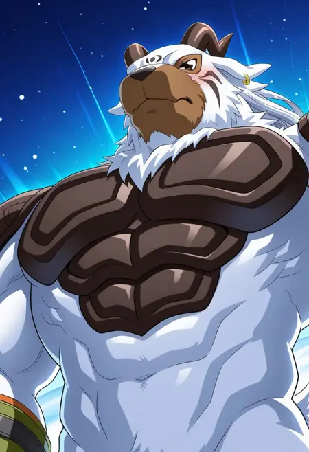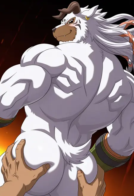强化提示: "兽迷,棕色眼睛,棕色角,短尾,白色毛发,健壮,男性化,成熟男性,宽大胸肌,棕色腹肌"