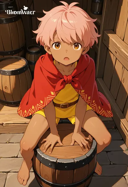 bloomwalker, 1소년, 남성 중심, 단독, 남성, 분홍색 머리, 단발, 갈색 눈, 빨간 망토, 망토, 노란 반바지, 반바지, 맨발, 소매 없음, 흰 셔츠, 액세서리, 벨트, 목에 달린 종, 후디, 후드