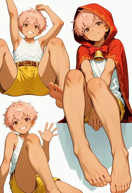 漫步花径,1个男孩,男性焦点,独身,男性,粉发,短发,棕眼,红色斗篷,斗篷,黄色短裤,短裤,赤脚,无袖,白衬衫,配饰,腰带,颈铃,连帽衫,帽子