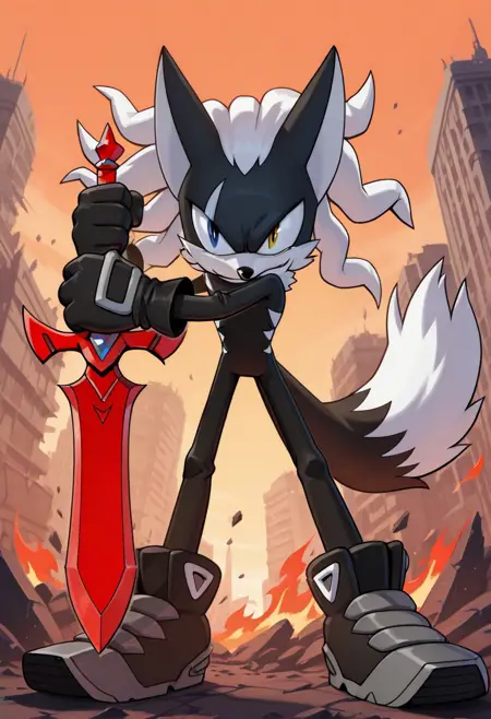 Zero the Jackal, black fur, white muzzle, scar on right eye, heterochromia, blue eye, yellow eye, white hair, black bodysuit, black tail with white tip, black shoes, holding red sword