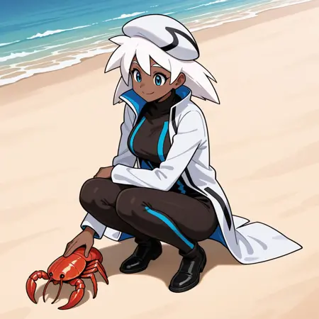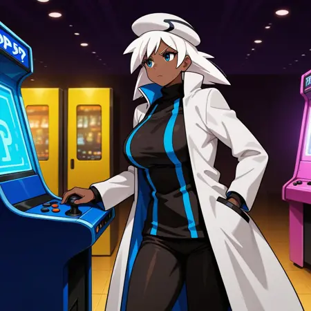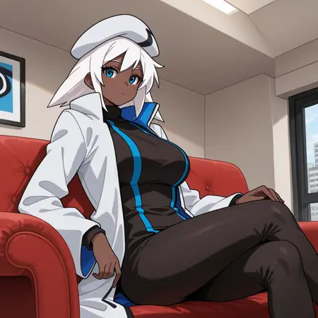 dark skin, dark-skinned female, tall female, white hair, blue eyes, hat