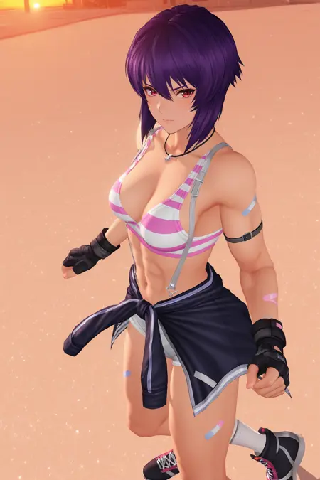 메인 프롬프트: StreetCornerStripes, 허리에 두른 재킷, 줄무늬 브라, 스니커즈, 신발, 흰 양말, 짧은 반바지, 손가락 없는 장갑, 스트랩, 팔에 붕대, 다리에 붕대, 양말, 수영복, 비키니 상의만, 목걸이, 복부, 배꼽