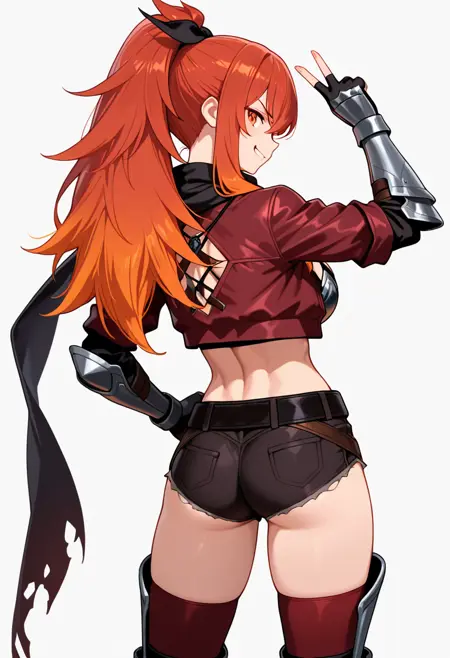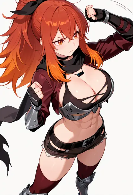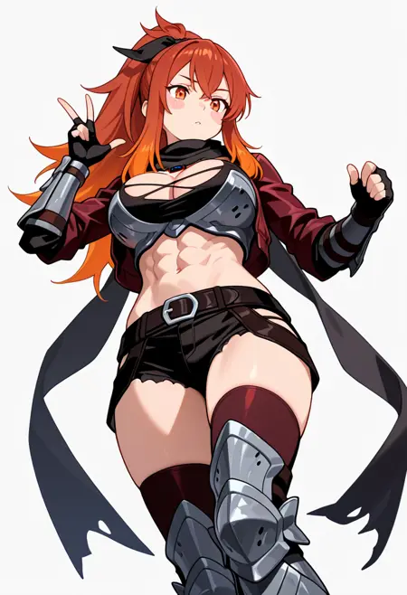 black scarf,fingerless gloves, midriff, armor, cropped jacket, short shorts, thighhighs, torn clothes, black belt, long sleeves, gauntlets, necklace,abs,armored boots,