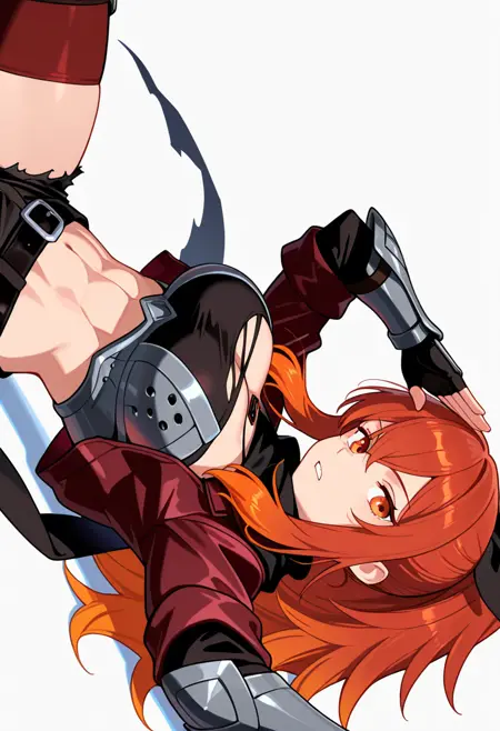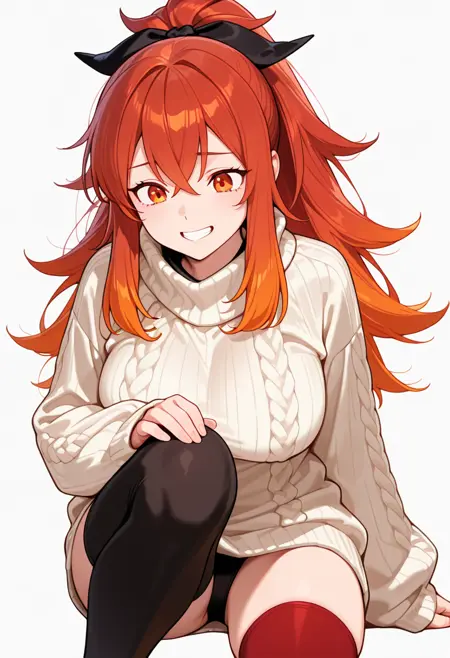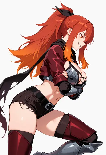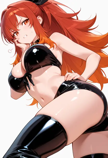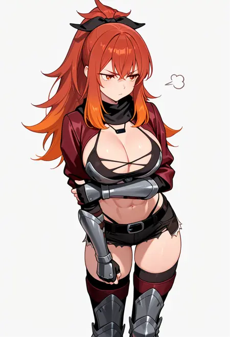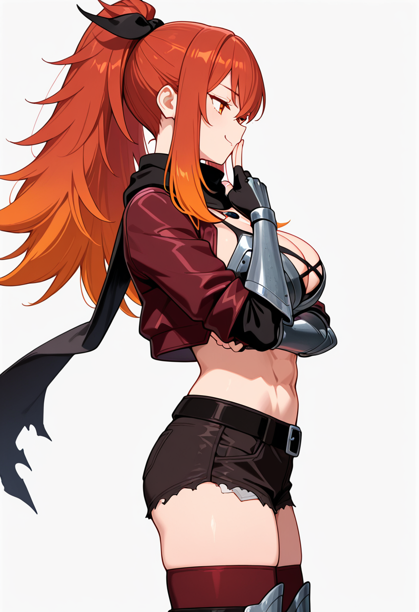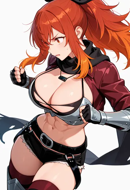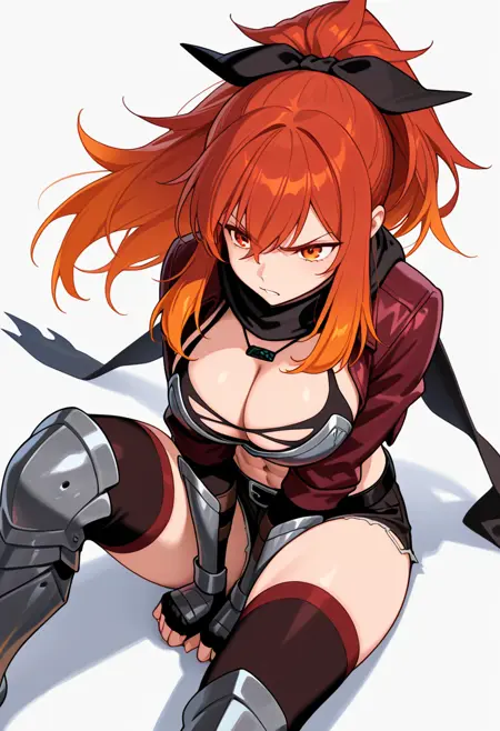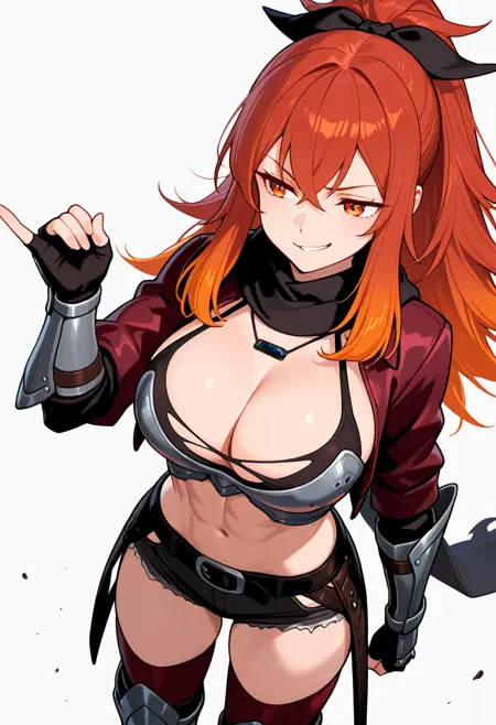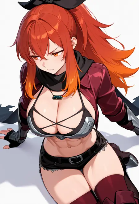 lysandra_cnr, 1girl, long hair, red hair, orange hair, ponytail, red eyes,gradient hair, large breasts, sidelocks, orange eyes,hair ribbon,