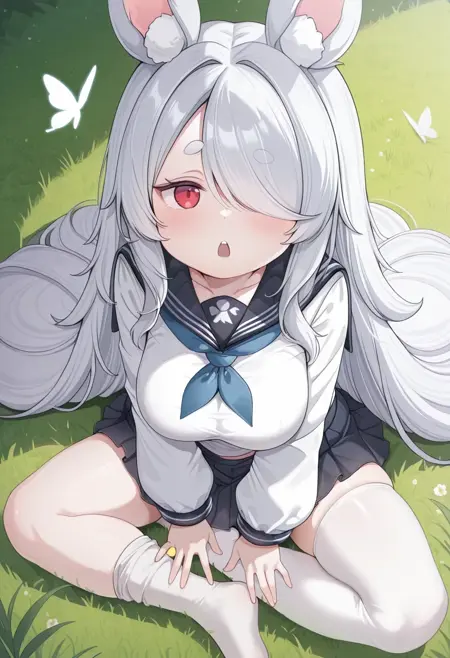 shirayukiAZL,thick eyebrows,short eyebrows,hair over one eye,one eye covered,white thighhighs,asymmetrical legwear,single thighhigh,