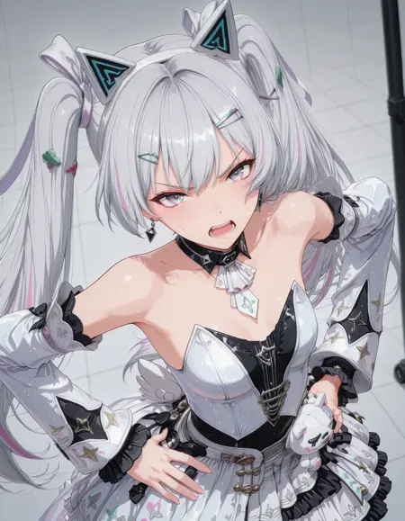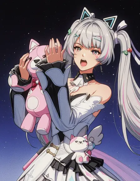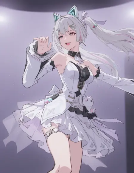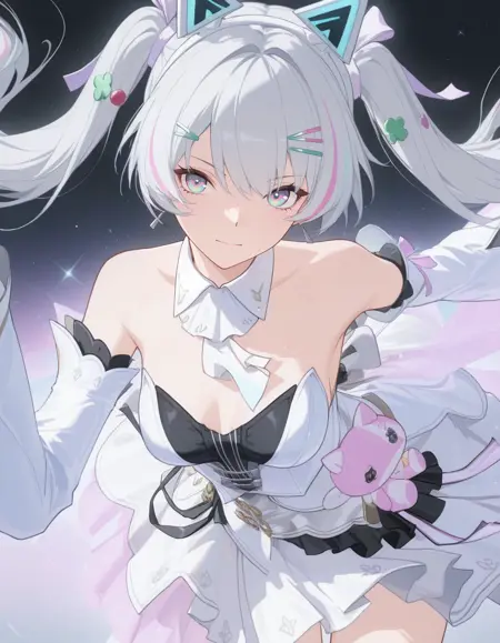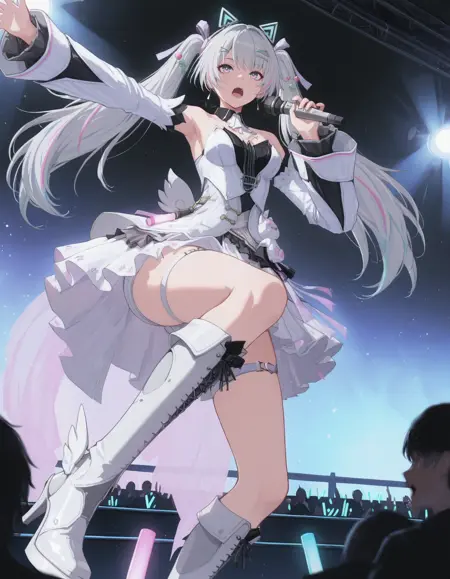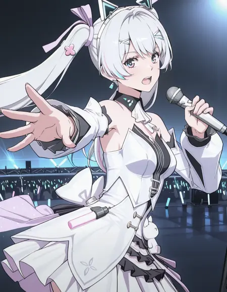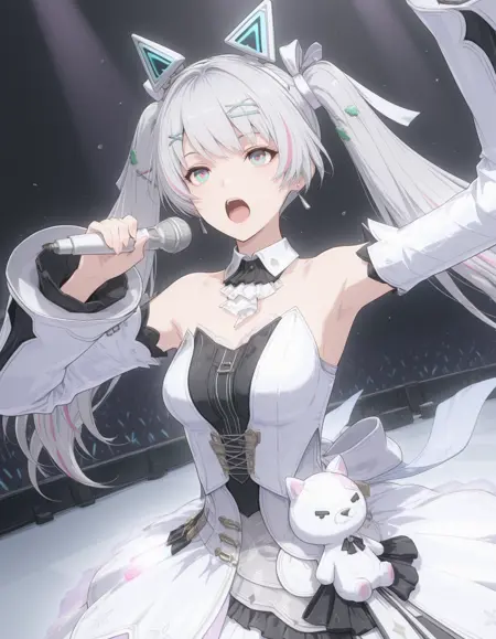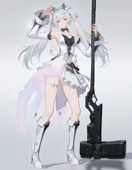 mai_pgr_karenina_blnh,long_hair,twintails,grey_hair,multicolored_hair,multicolored_eyes,hair_ornament,hairclip,fake_animal_ears,idol_clothes,detached_sleeves,detached_collar,white_dress,white_skirt,frilled_dress,thigh_strap,knee_boots,high_heels,white_footwear,stuffed_toy,huge_weapon,war_hammer