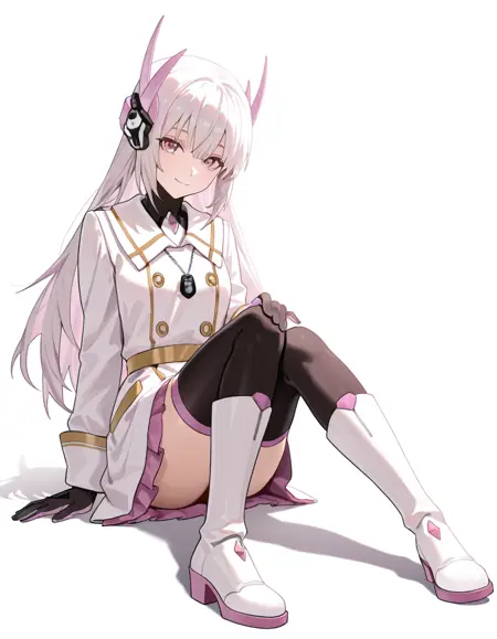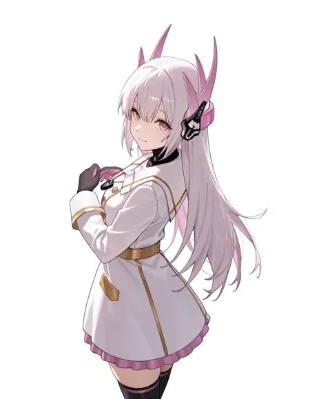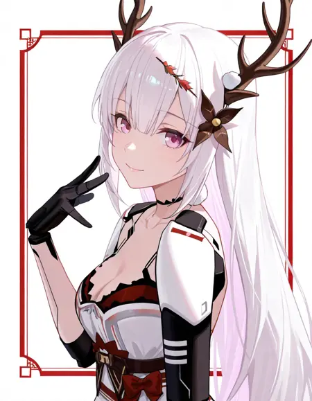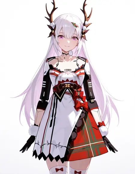 Christmas Promise, Liv, CmP_dress, CmP_neck_ornament, CmP_belt, CmP_dress_bow, CmP_skirt, CmP_hair_flower, CmP_hair_ornament, CmP_mechanical_arms, CmP_antlers, CmP_white_dress, CmP_thighhighs, CmP_high_heels, mechanical arms, CmP_barcode_tattoo