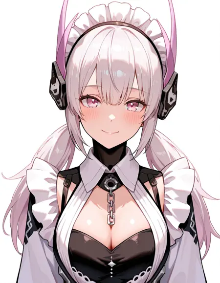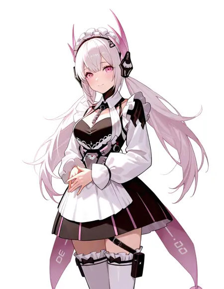 Maid of Time, MoT_two-tone_dress, MoT_stomach_armor, MoT_dress_tails, MoT_maid_apron, liv_headgear, MoT_chain_necklace, MoT_maid_headdress, MoT_high_heel_boots, MoT_thigh_holster, MoT_frilled_thighhighs, MoT_thigh_bow