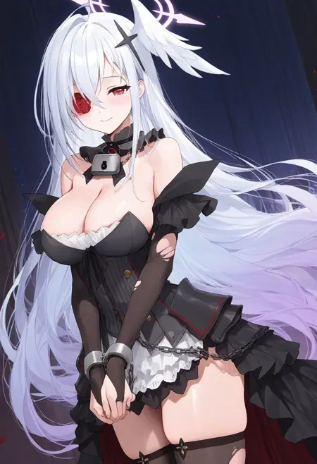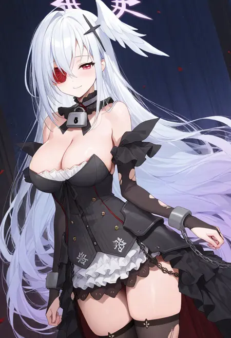 black hair ornament,red rose,single covered eye,flower over eye,steel choker,lock,black collar,chain,handcuffs,arm scrunchie,black bridal gauntlets,torn bridal gauntlets,black thighhighs,torn thighhighs,cleavage,black dress,black skirt,black armor,wine red trim,wine red inner skirt