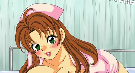 AKinoshita,Brown hair,earrings,long hair,green eyes,makeup,nurse cap,nurse,collares shirt,cleavage,name tag,nail polish,red nails,