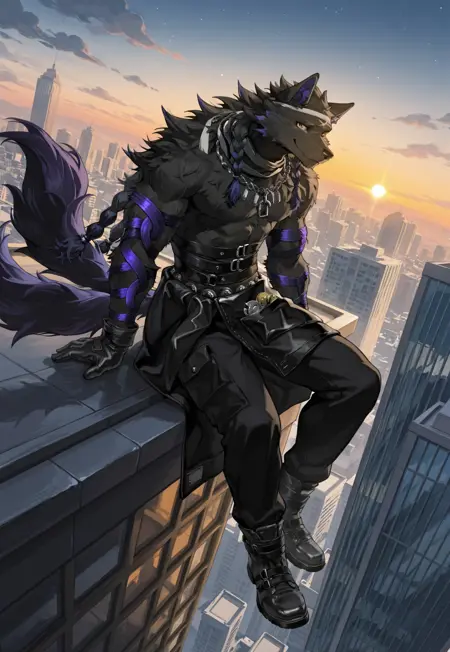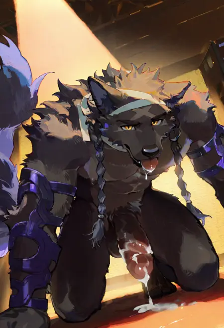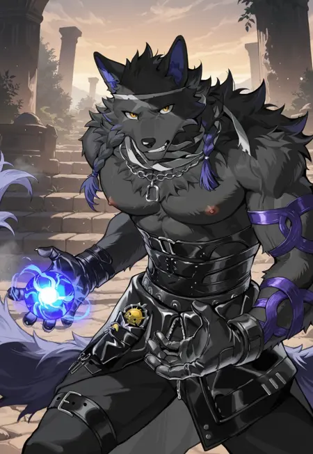 프롬프트(모두): aby55, wolf boy, wolf tail, bandaged head, purple armlet, chain necklace, (single braid, twin braids, tri braids)