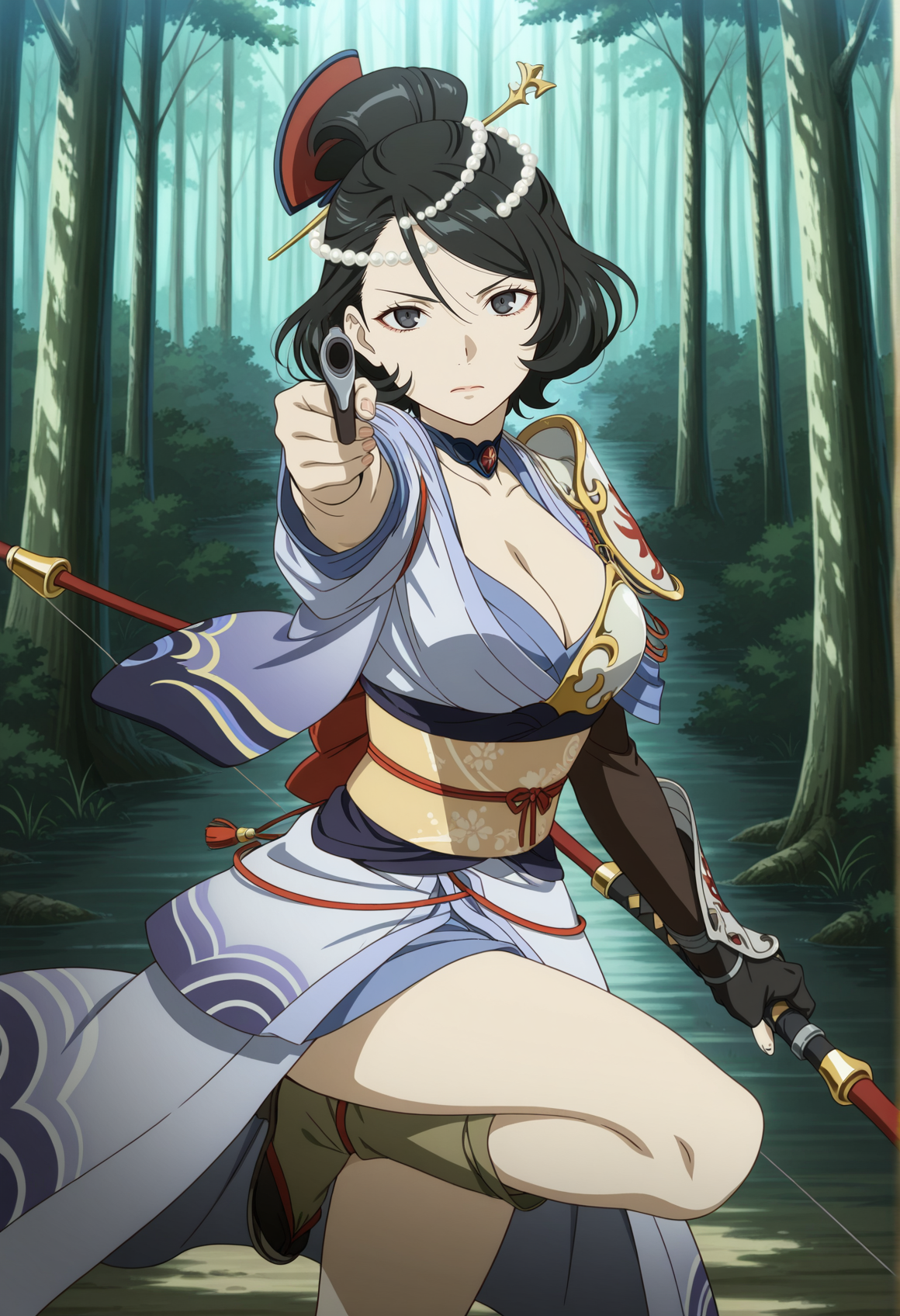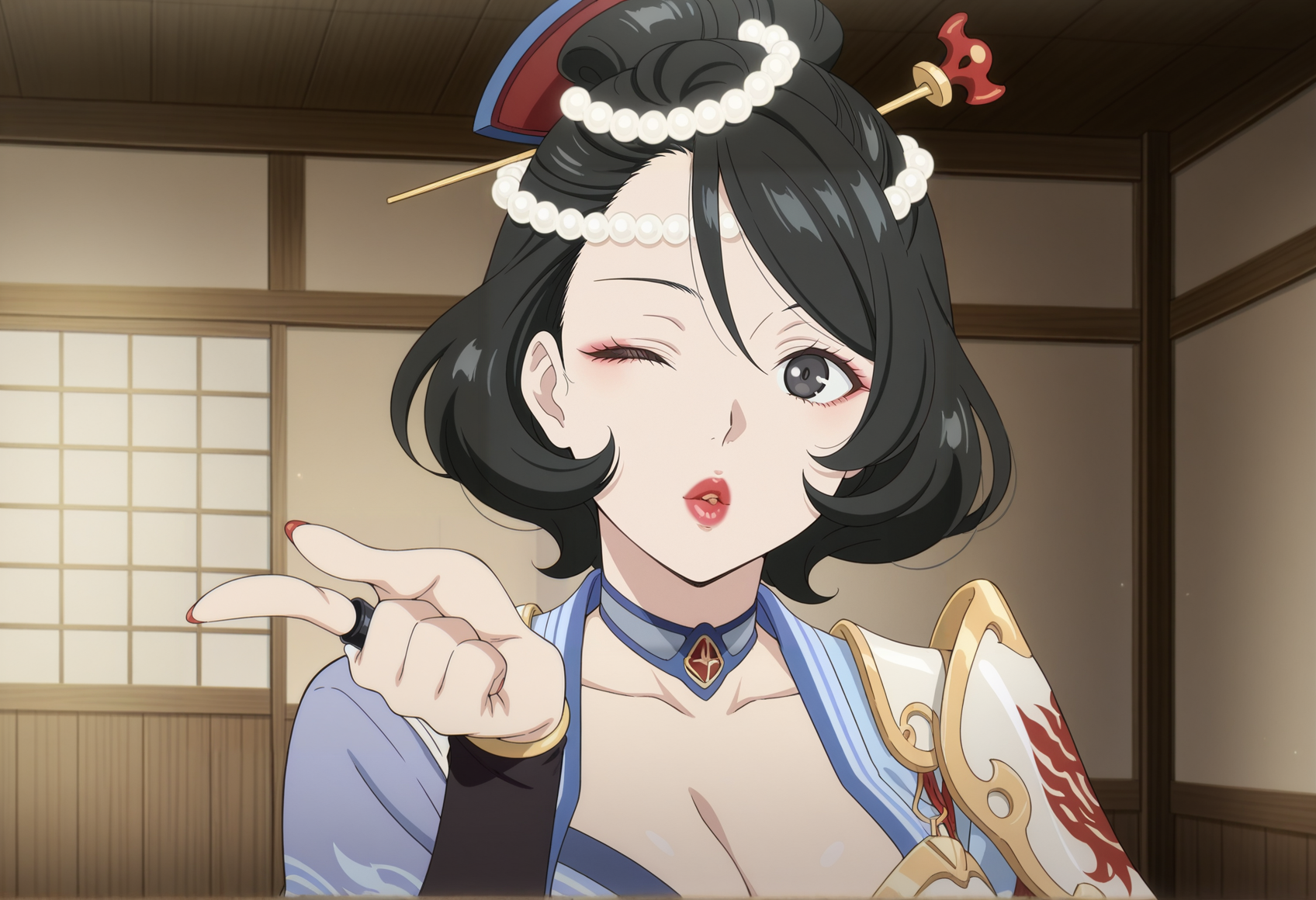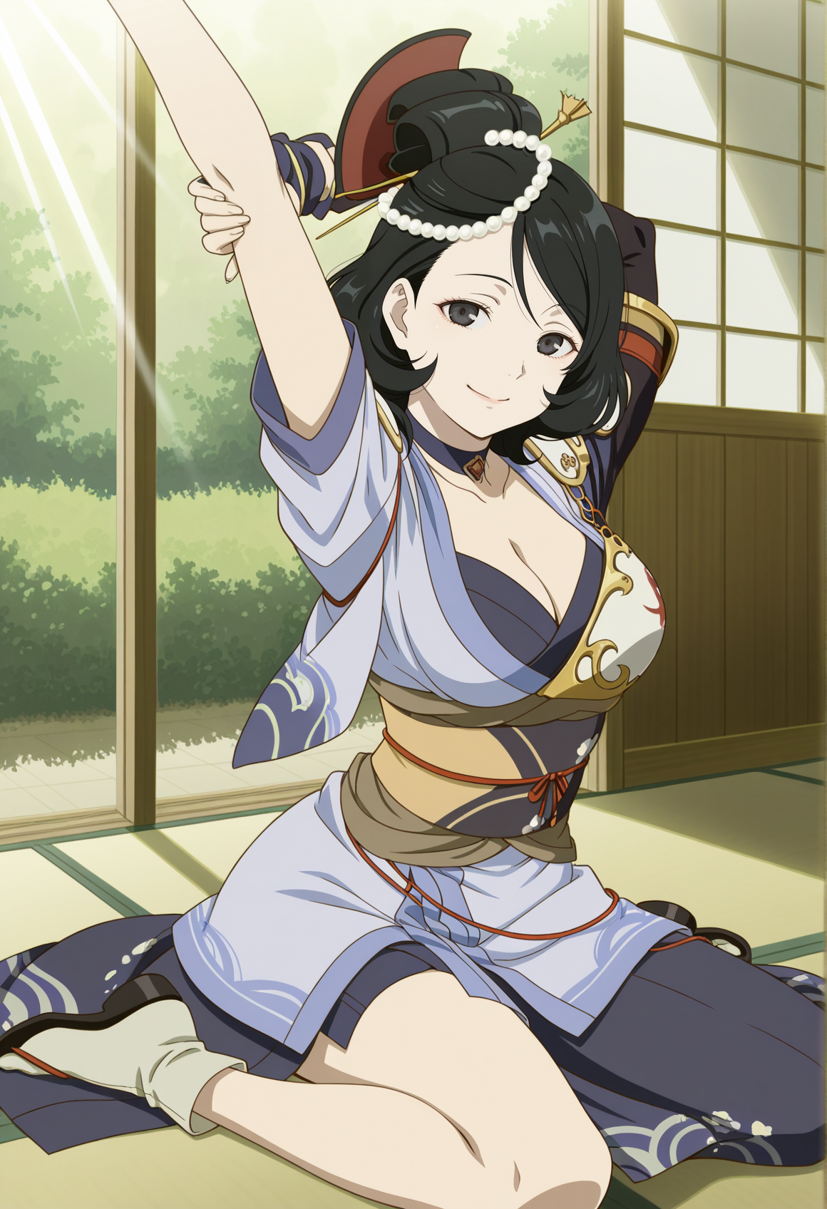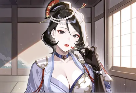 주요 태그: 검은 머리카락, 검은 눈, 진주 머리 장식, 단일 머리빗, 빗, 초커, 가슴 부분 노출, 일본 복장, 한쪽 어깨 패드, 비대칭 복장, 비대칭 팔 착용, 측면 슬릿