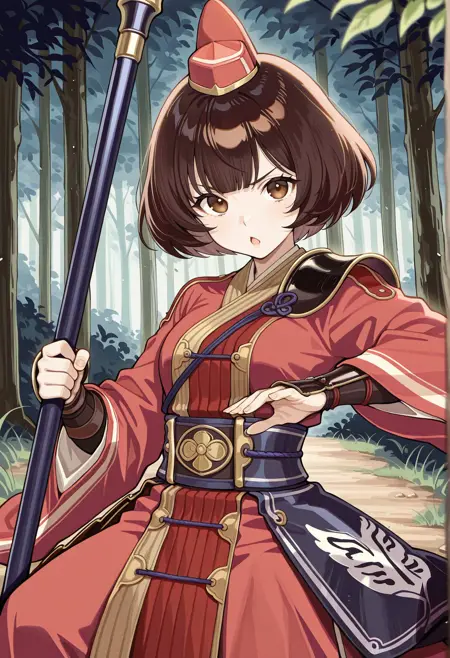 短发、棕眼睛、棕发、帽子、和服、单肩护甲、护腕、长袖、宽袖