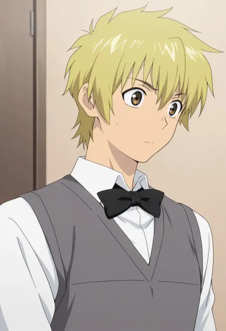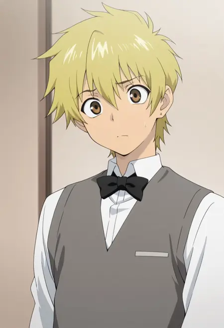 1个男孩,男性焦点,单人,棕色眼睛,金发,白色衬衫,有领衬衫,黑色领结,灰色背心,黑色长裤,