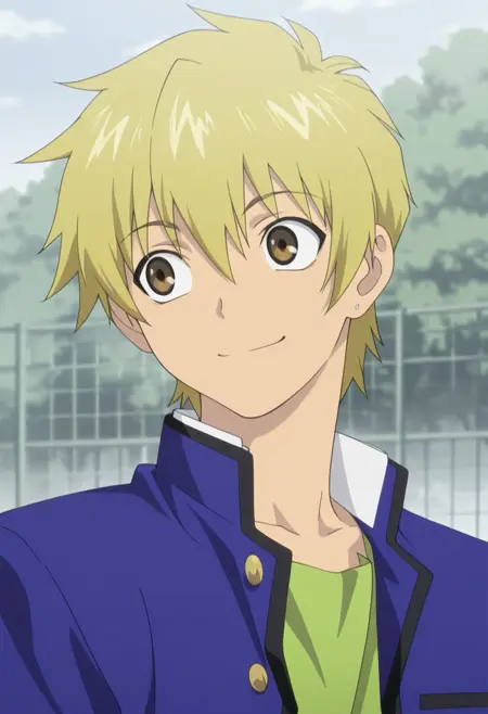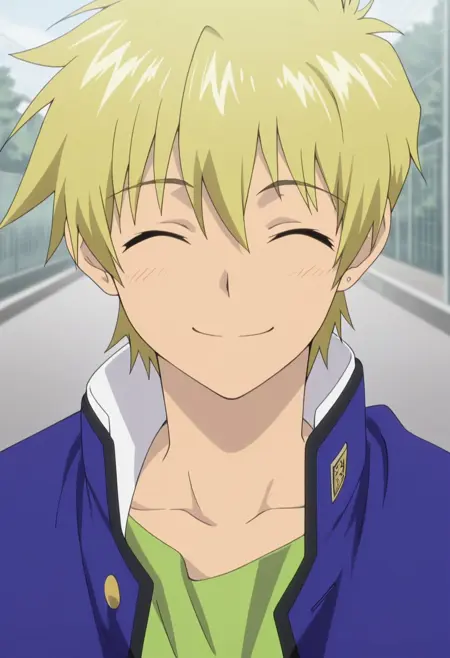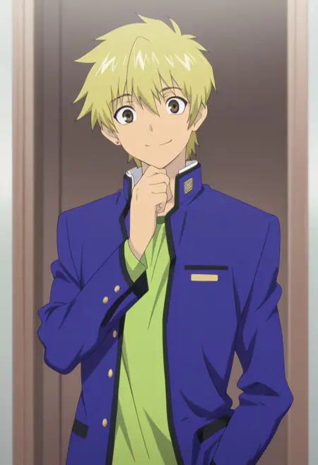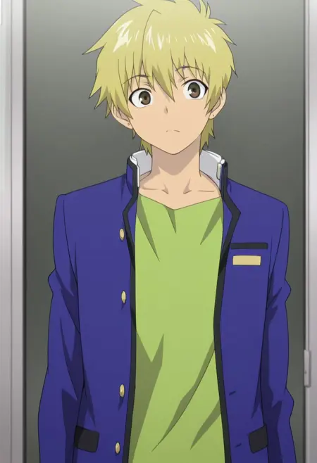 1个男孩,男性焦点,单人,棕色眼睛,金发,校服,学兰服,蓝色夹克,敞开夹克,绿色衬衫,蓝色长裤,运动鞋,