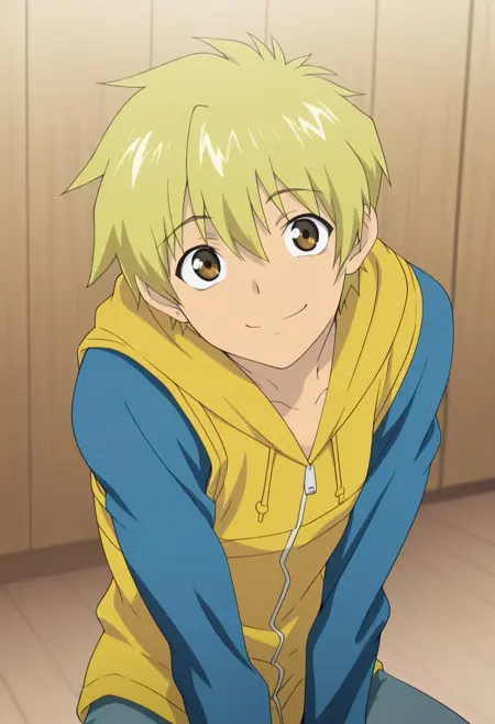 1个男孩,男性焦点,单人,棕色眼睛,金发,蓝色衬衫,长袖,黄色夹克,无袖夹克,连帽,灰色短裤,