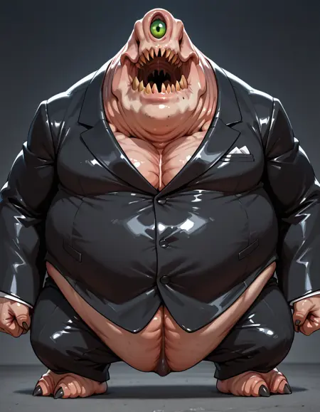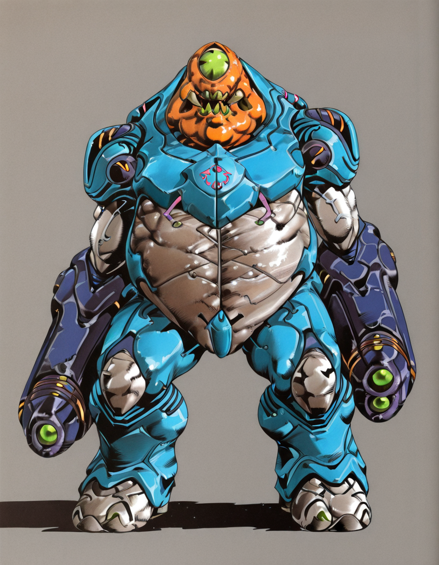 alien, glowing, mancubus, mecha, monster, mountain, no humans, pink skin, robot, samus aran, science fiction, sharp teeth, solo, teeth, weapon