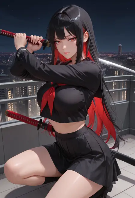 Akai Hime Akane Kagura、黒髪、赤い目、長い髪、ツートーンヘア、赤髪、色付き内毛、大きな胸