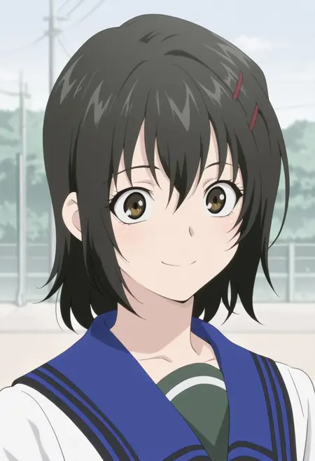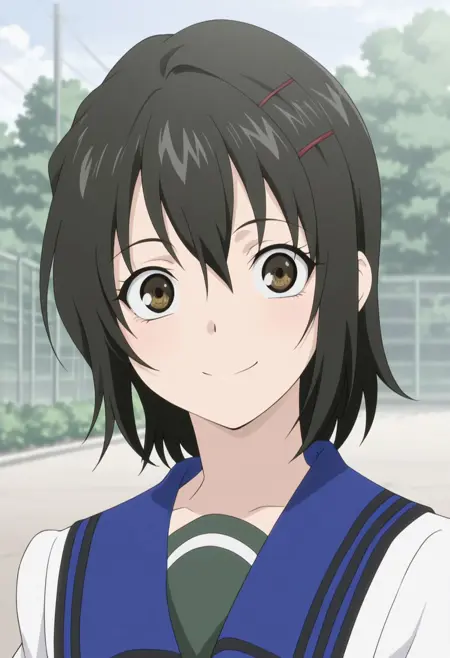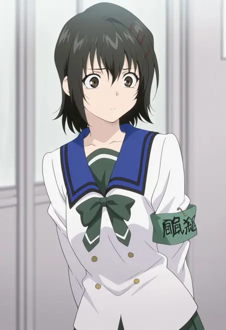 1girl, solo, 갈색 눈, 검은 머리, 헤어클립, 학교 유니폼, serafuku, 흰색 셔츠, 파란 해군 칼라, 팔찌, 녹색 치마, 검은 양말, 신발, 갈색 신발,