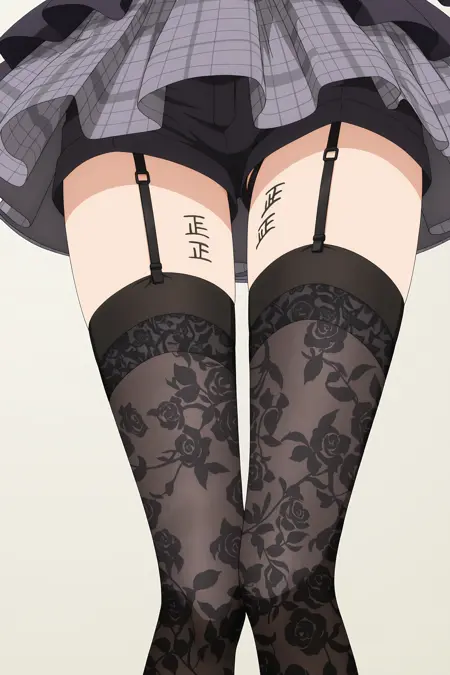 검은 드레스, 십자 끈으로 매인 옷, 검은 허벅지 양말, 드레스 리프트, 프린트 허벅지 양말, 긴 드레스, 흰색 프릴, 검은 칼라, 가터 스트랩, 검은 신발, 검은 넥타이, 플랫폼 힐, 체인 레시, 긴 소매, 프릴 드레스, 손목을 넘는 소매, 가슴 사이의 넥타이, 십자 끈으로 매인 드레스,