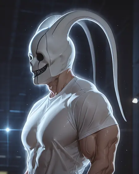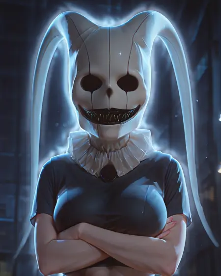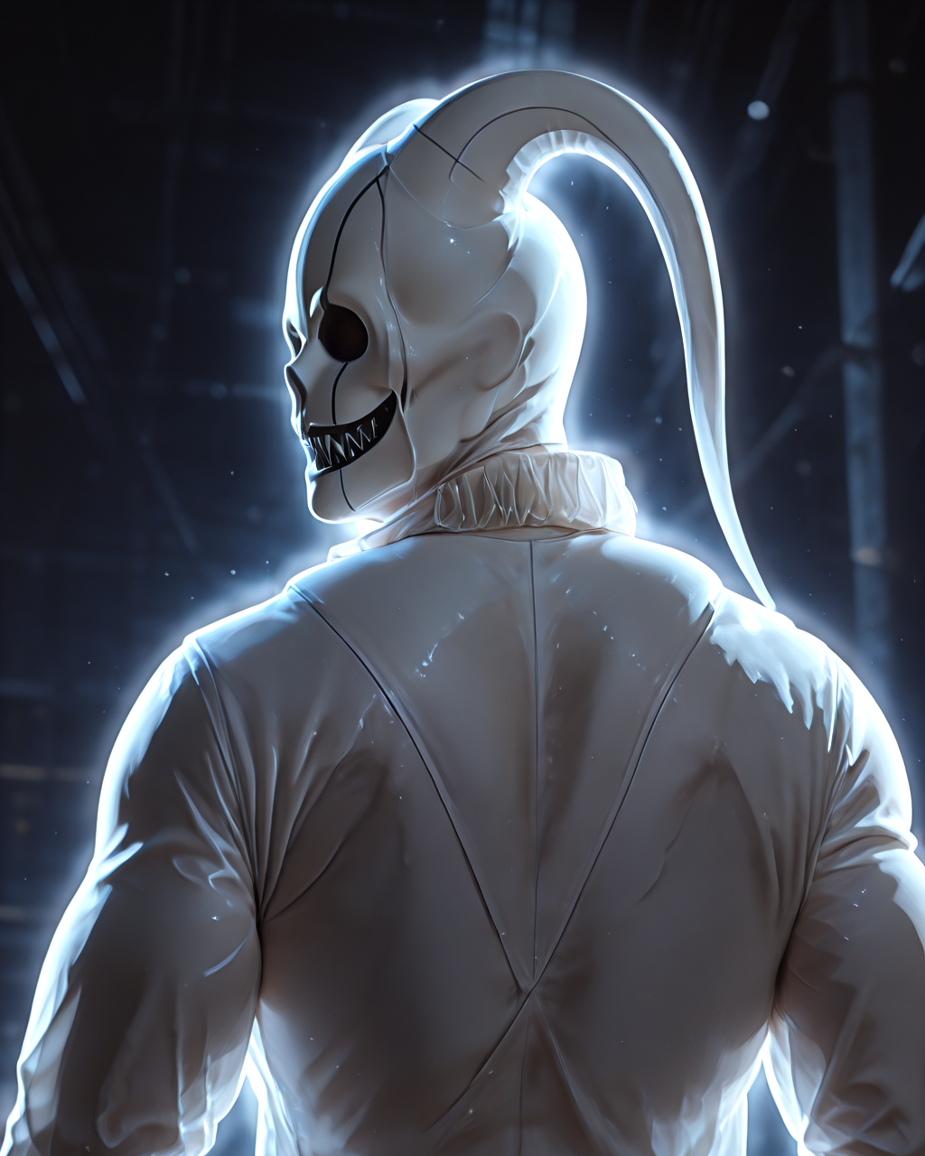 white mask, ghost mask, solid mask, sharp teeth, black teeth, two long, gracefully curved appendages,