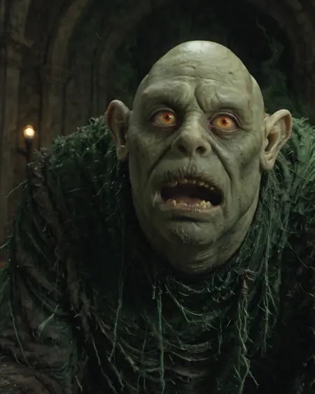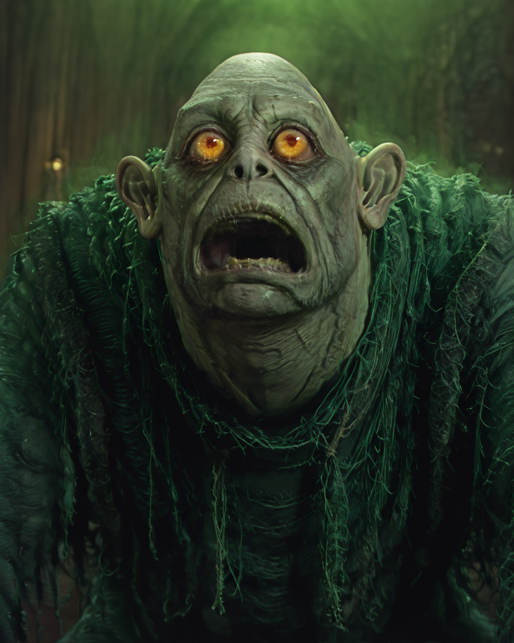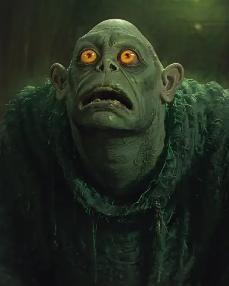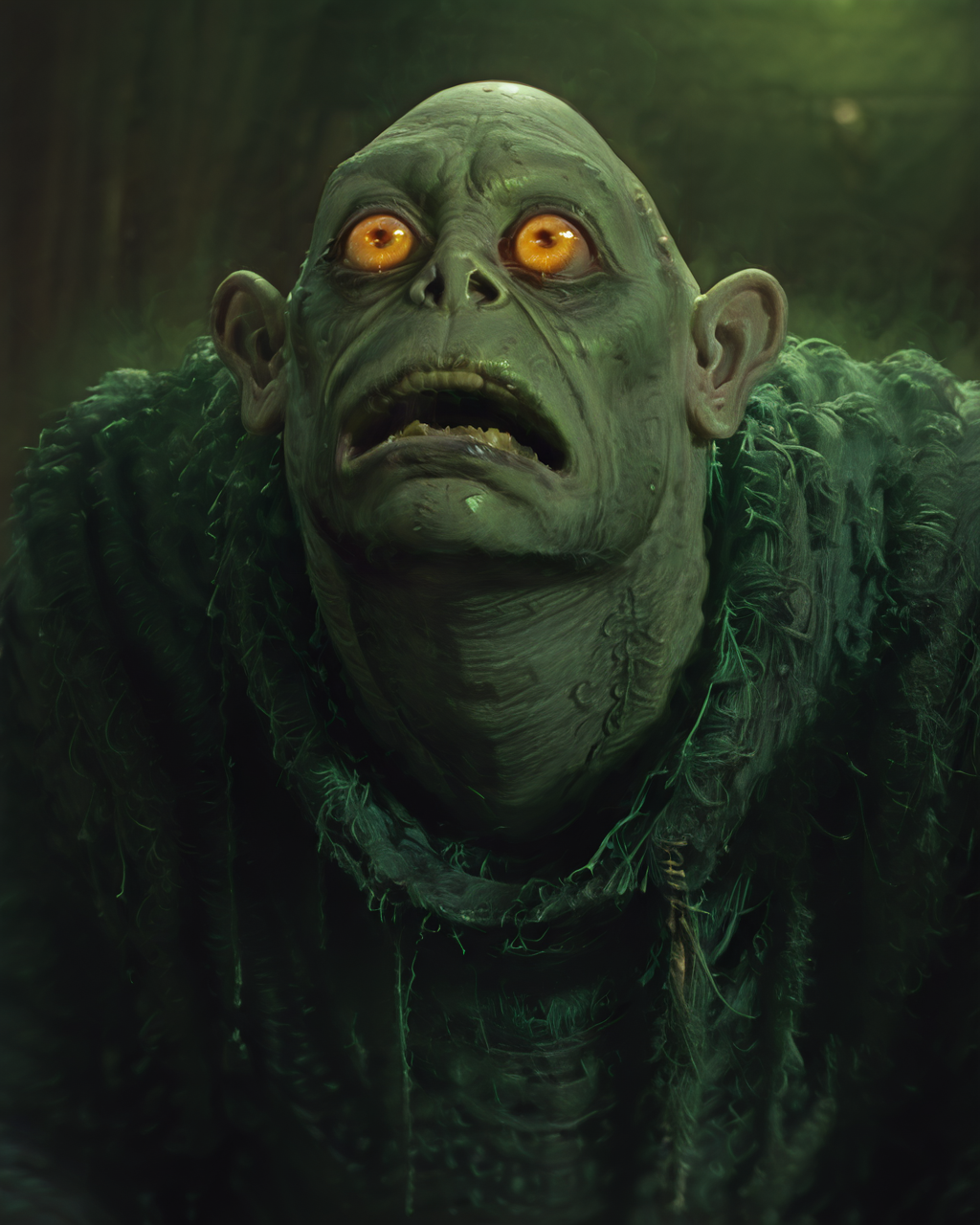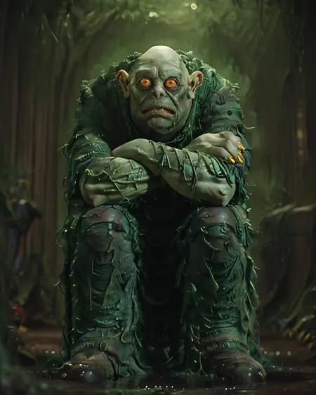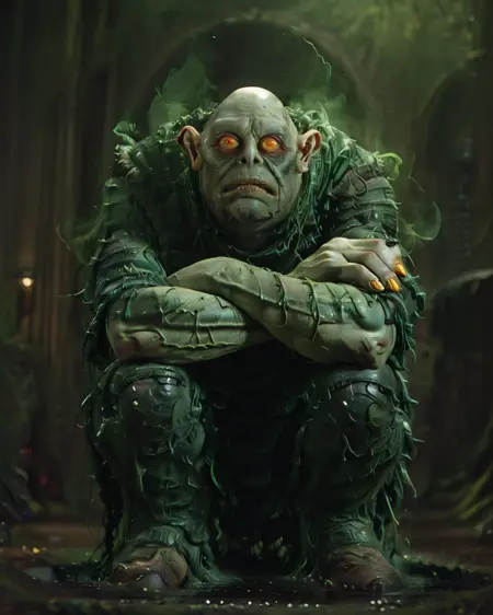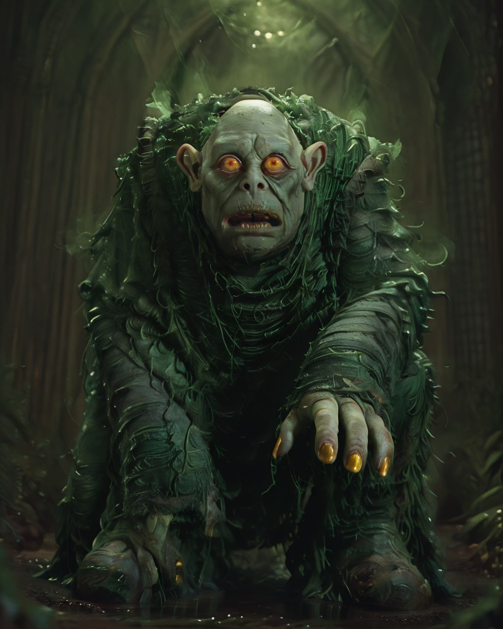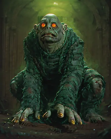 monster, no human, pale green skin, big eyes, hunchback, bald, covered in mud, yellow nails, bad skin,