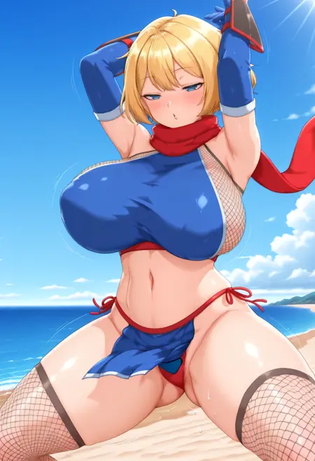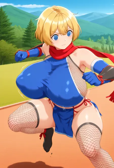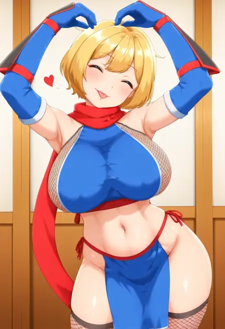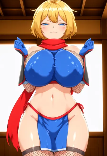 NinjaWebAnekiCostume, pelvic curtain, red scarf, blue bodysuit, halterneck, fishnet top, blue elbow gloves, kote, bare shoulders, crop top, midriff, fishnet thighhighs,