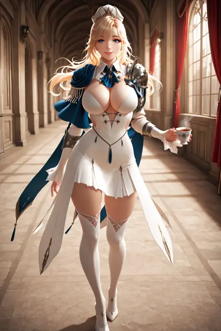 Outfit prompts: thighhighs, gloves, dress, cleavage, cape, white dress, armor, high heels, white thighhighs, white footwear, shoulder armor, capelet, white headwear, white skirt
