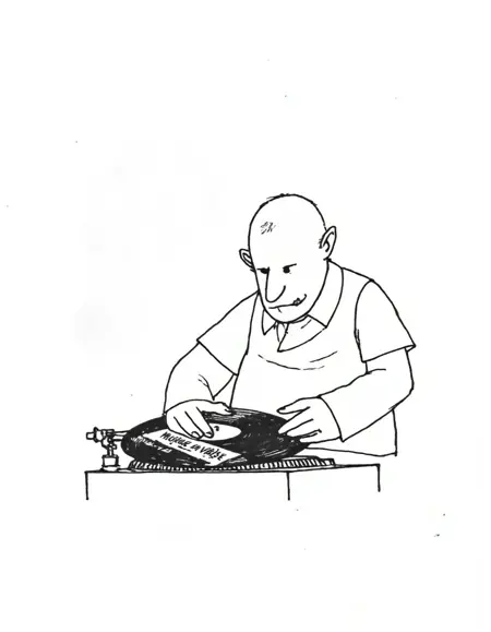 頭に魚鉢を持ち、その中で小さな魚が泳いでいる男性が、シンプルな木製の椅子に座り、片手を頬に添えて考え込むポーズを取っている。もう一方の手は膝にだらんと垂れ、背景は単色の、キノのスタイルで描いたイラスト