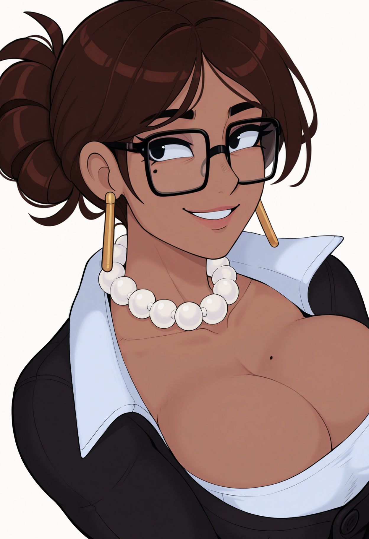 • 복장 태그: 안경, 검은 프레임 안경, 귀걸이, 진주 목걸이, 검정 재킷, 단추, 흰 셔츠, 속옷, 가슴선, 칼라 셔츠, 검정 바지