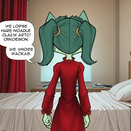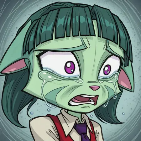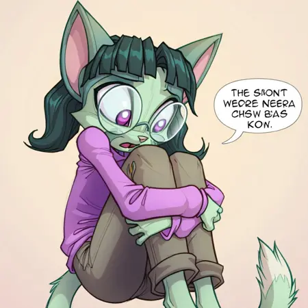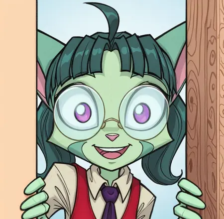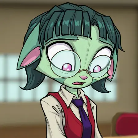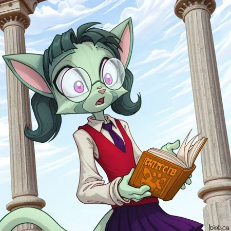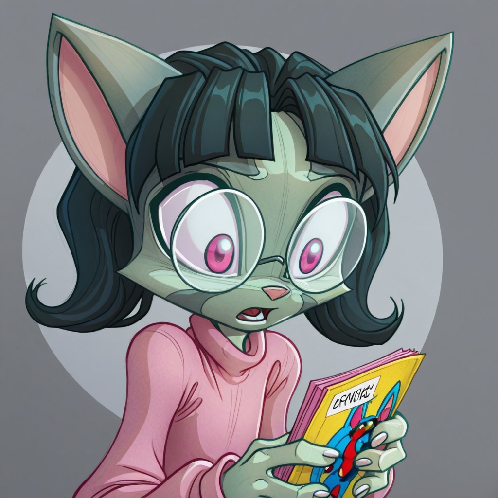 prelude_lilith_dk, solo, 1girl, furry, furry female, glasses, black hair, animal ears, colored skin, round eyewear, purple eyes, green hair, cat ears, green skin, pink eyes, bangs, tail, cat tail, twintails, cat girl,