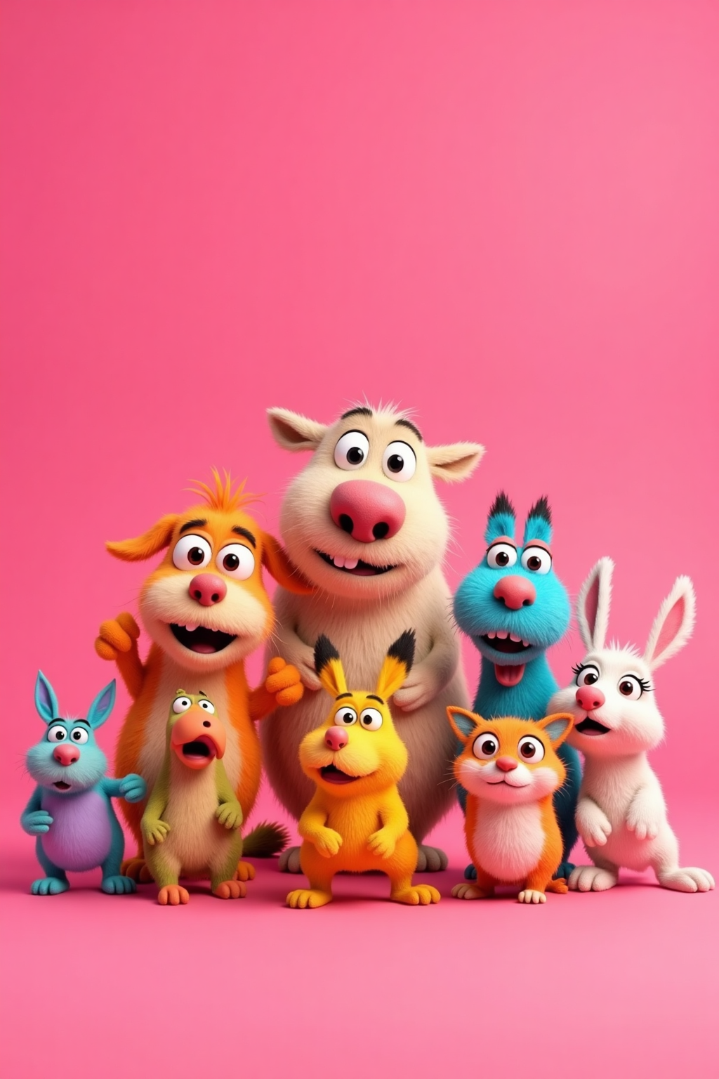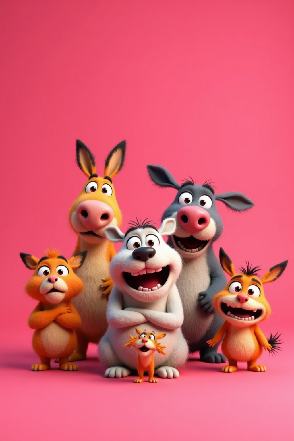 3Dアニメーションされた動物キャラクター、それぞれが誇張された表情をし、明るいピンクの背景に、ユーモラスで鮮やかな感情を表現。