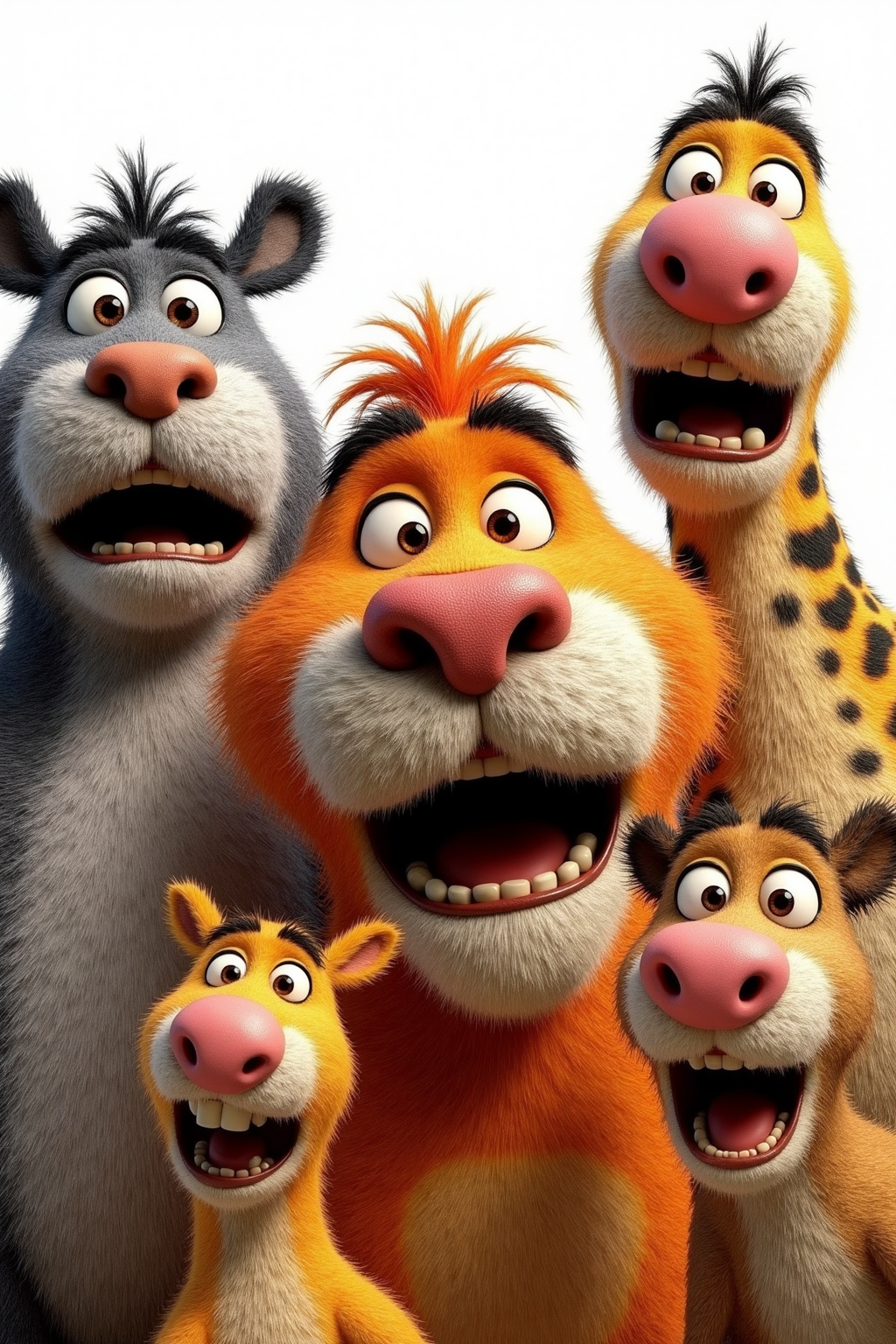 3Dアニメーションされた動物キャラクター、野生種と家畜種を組み合わせ、すべてがお笑いのような表情で、活気に満ちたユーモラスなシーンを構成。