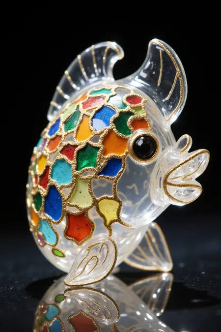 다채로운 에나멜 장식이 있는 투명한 몸체, 활기찬 물고기를 형상화하며, 비늘들이 반짝이고, 수영하는 자세, 에나멜 색상은 바다의 색조를 모방하며, 투명한 지느러미가 유동적으로 흐른다.