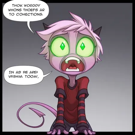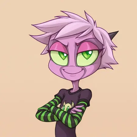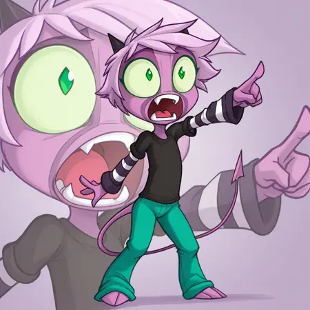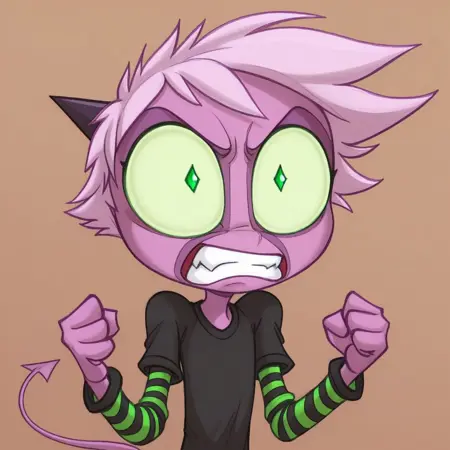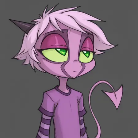 prelude_namah_dk, 1girl, solo, green eyes, short hair, horns, furry, furry female, pink hair, tail, colored skin, horns, colored sclera, tail, demon tail,