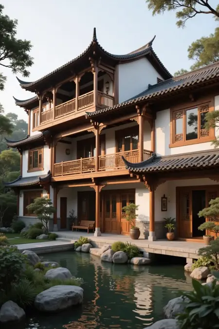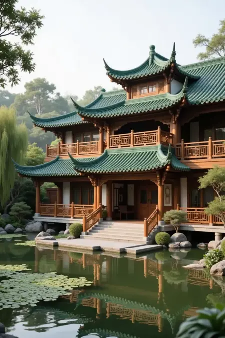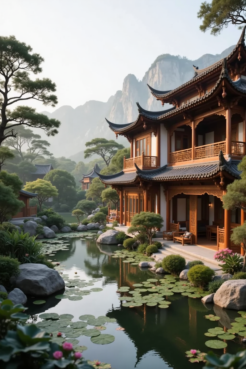 中国伝統的建築スタイル、反り返った屋根と赤茶色の木構造を持つ河畔の別荘、庭には蓮の池、遠くには霧に包まれた山々。