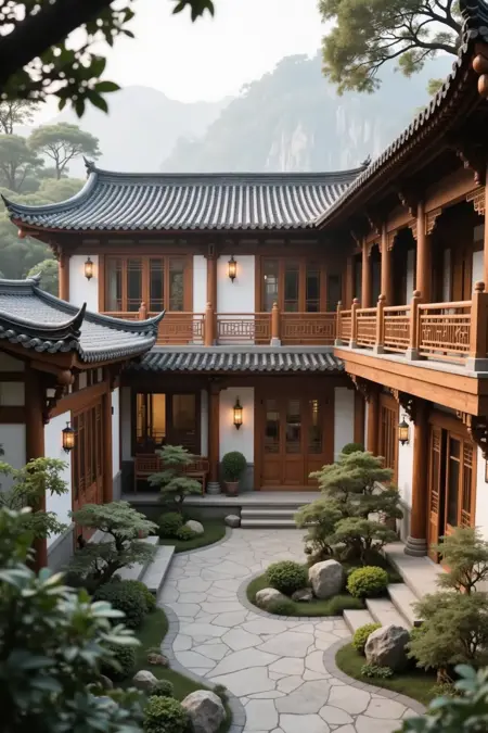 中国伝統的建築スタイル、複数の庭をもつ住宅、灰色の瓦の屋根、白塗りの壁、古代風の提灯、曲がりくねった岩庭の道。