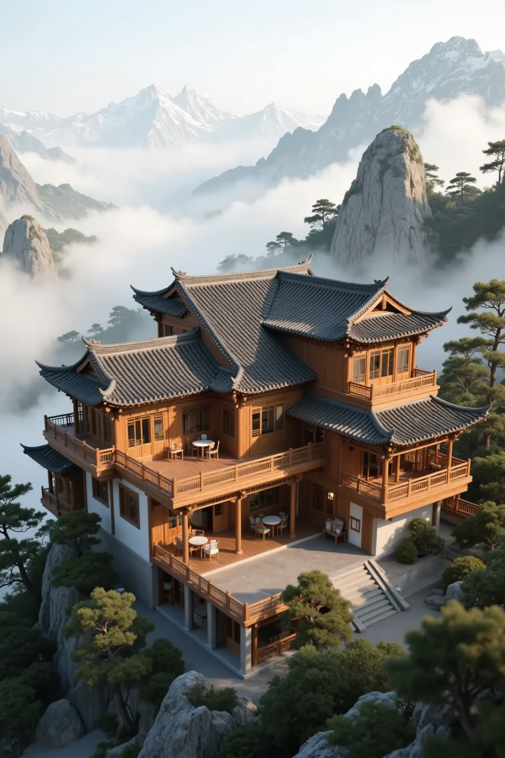 中国伝統的建築スタイル、山頂にある住居、簡素な木造構造、広いパノラマ窓、周囲には松の木、雲に包まれた峰々。